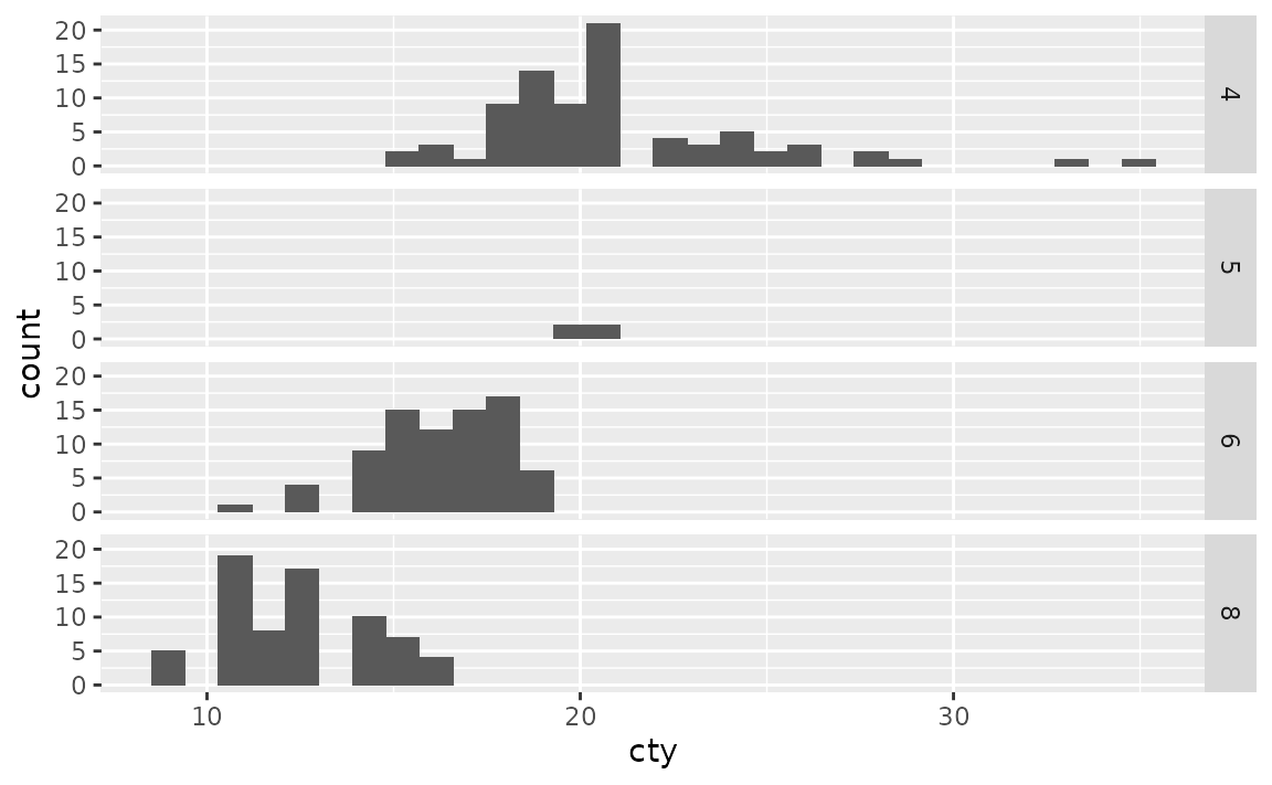 Similarly, you can also use facet_grid() to facet by a single categorical variable as well. In the formula notation, you use a . to indicate that no faceting should be done along that axis, i.e. cyl ~ . facets across the y-axis (within a column) while . ~ cyl facets across the x-axis (within a row).