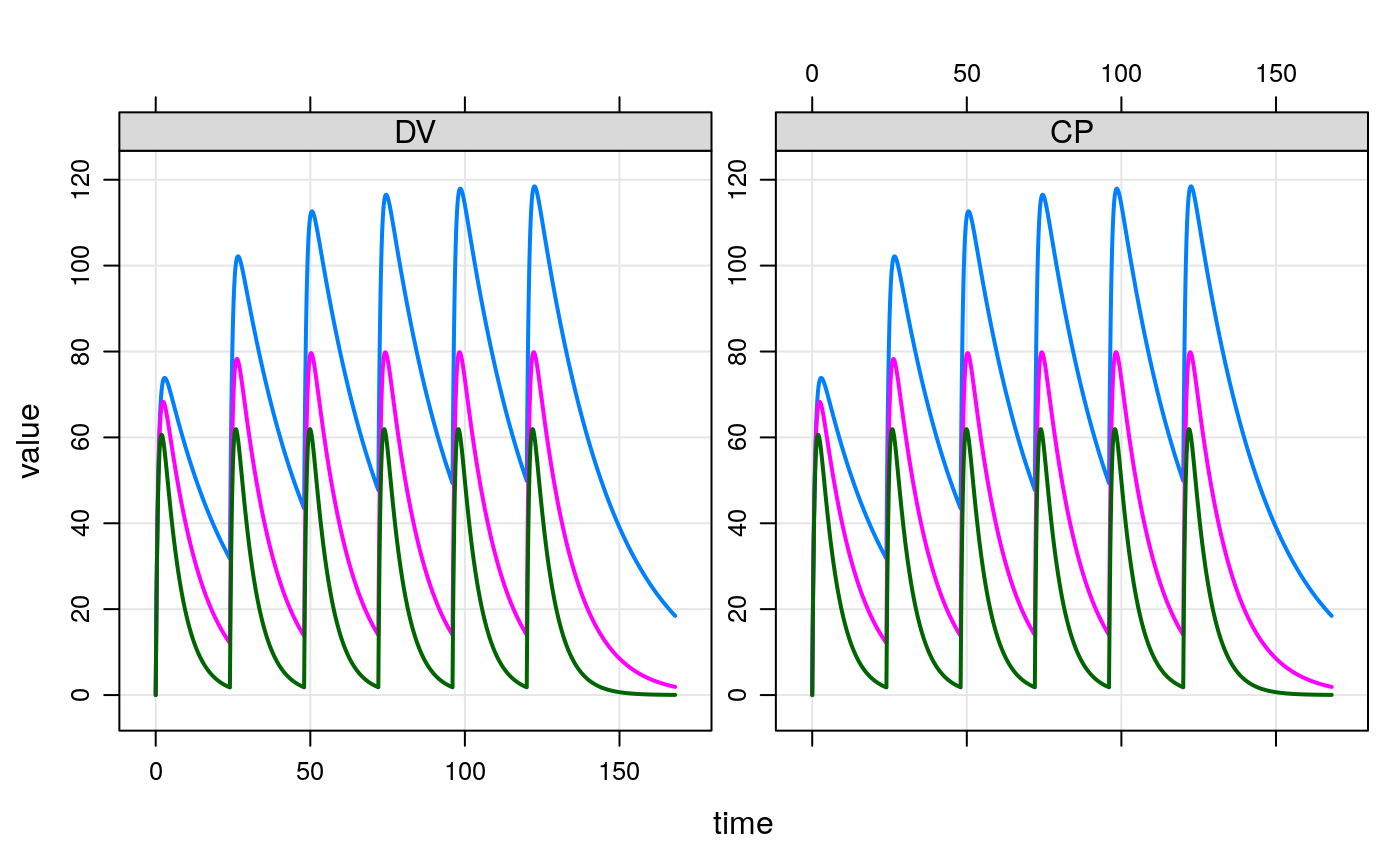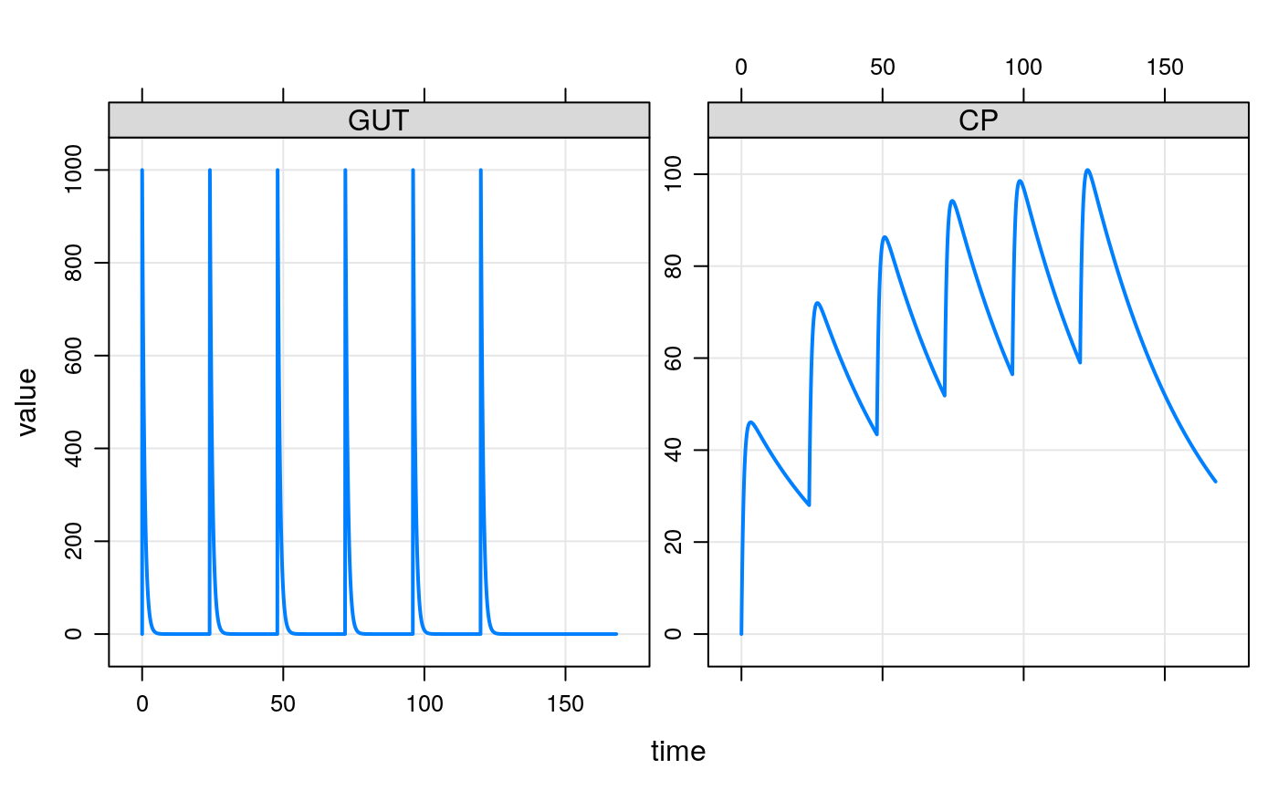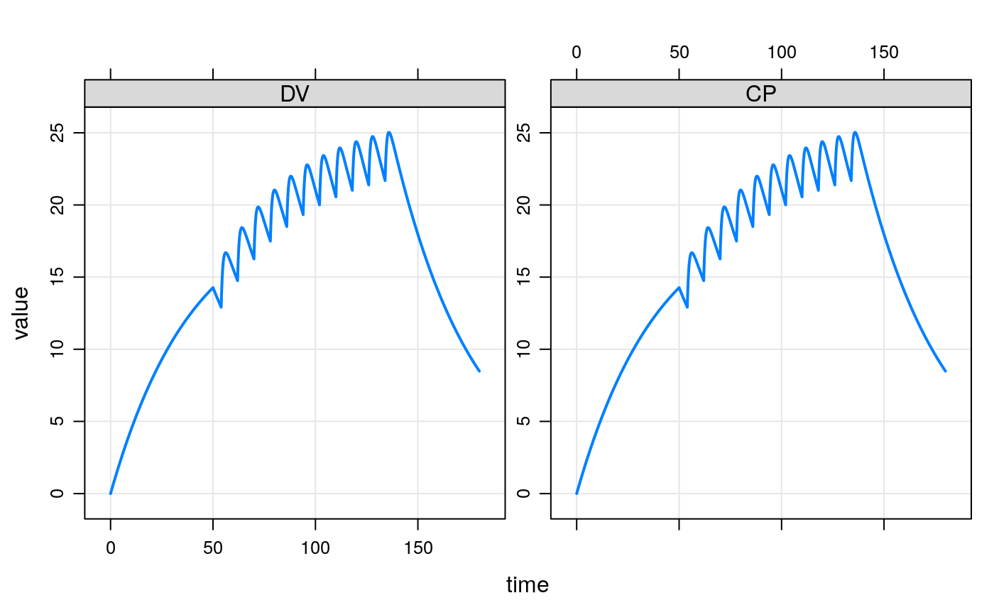 ## example("mrgsolve") mod <- mrgsolve::house(delta=0.1) %>% param(CL=0.5) events <- ev(amt=1000, cmt=1, addl=5, ii=24) events#> Events: #> time amt ii addl cmt evid #> 1 0 1000 24 5 1 1mod#> #> #> -------------- source: housemodel.cpp -------------- #> #> project: /data/deployment...solve/project #> shared object: mrgsolve #> #> time: start: 0 end: 120 delta: 0.1 #> add: <none> #> #> compartments: GUT CENT RESP [3] #> parameters: CL VC KA F1 D1 WT SEX WTCL WTVC SEXCL #> SEXVC KIN KOUT IC50 [14] #> captures: DV CP [2] #> omega: 4x4 #> sigma: 1x1 #> #> solver: atol: 1e-08 rtol: 1e-08 maxsteps: 20k #> ------------------------------------------------------see(mod)#> #> Model file: housemodel.cpp #> $PROB #> #> # `mrgsolve` housemodel #> #> This model is compiled with `mrgsolve`. #> #> - Author: Metrum Research Group, LLC #> - Description: Generic indirect response PK/PD model #> - Covariates: Weight, female sex #> - Random effects: CL, VC, KA, KOUT #> - Error model: exponential #> #> #> #> $PLUGIN base #> #> $PARAM @annotated #> CL : 1 : Clearance (L/hr) #> VC : 20 : Volume of distribution (L) #> KA : 1.2 : Absorption rate constant (1/hr) #> F1 : 1.0 : Bioavailability fraction (.) #> D1 : 2.0 : Infusion duration (hr) #> WT : 70 : Weight (kg) #> SEX : 0 : Covariate female sex #> WTCL : 0.75 : Exponent WT on CL #> WTVC : 1.00 : Exponent WT on VC #> SEXCL: 0.7 : Prop cov effect on CL #> SEXVC: 0.85 : Prop cov effect on VC #> KIN : 100 : Resp prod rate constant (1/hr) #> KOUT : 2 : Resp elim rate constant (1/hr) #> IC50 : 10 : Conc giving 50% max resp (ng/ml) #> #> $CMT @annotated #> GUT : Dosing compartment (mg) #> CENT : Central compartment (mg) #> RESP : Response (unitless) #> #> $OMEGA @labels ECL EVC EKA EKOUT #> 0 0 0 0 #> #> $SIGMA @labels EXPO #> 0 #> #> $SET end=120, delta=0.25 #> #> #> $GLOBAL #> #define CP (CENT/VCi) #> #define INH (CP/(IC50+CP)) #> #> typedef double localdouble; #> #> $MAIN #> F_GUT = F1; #> D_CENT = D1; #> #> double CLi = exp(log(CL) + WTCL*log(WT/70) + log(SEXCL)*SEX + ECL); #> double VCi = exp(log(VC) + WTVC*log(WT/70) + log(SEXVC)*SEX + EVC); #> double KAi = exp(log(KA) + EKA); #> double KOUTi = exp(log(KOUT) + EKOUT); #> #> RESP_0 = KIN/KOUTi; #> #> $ODE #> dxdt_GUT = -KAi*GUT; #> dxdt_CENT = KAi*GUT - (CLi/VCi)*CENT; #> dxdt_RESP = KIN*(1-INH) - KOUTi*RESP; #> #> $TABLE #> double DV = CP*exp(EXPO); #> #> $CAPTURE @annotated #> DV: Dependent variable (ng/ml) #> CP: Plasma concentration (ng/ml) #>#> #> Model parameters (N=14): #> name value . name value #> CL 0.5 | SEX 0 #> D1 2 | SEXCL 0.7 #> F1 1 | SEXVC 0.85 #> IC50 10 | VC 20 #> KA 1.2 | WT 70 #> KIN 100 | WTCL 0.75 #> KOUT 2 | WTVC 1init(mod)#> #> Model initial conditions (N=3): #> name value . name value #> CENT (2) 0 | RESP (3) 50 #> GUT (1) 0 | . ... .#> ID time GUT CENT RESP DV CP #> 1 1 0.0 0.0000 0.0000 50.00000 0.000000 0.000000 #> 2 1 0.0 1000.0000 0.0000 50.00000 0.000000 0.000000 #> 3 1 0.1 886.9204 112.9355 48.03655 5.646775 5.646775 #> 4 1 0.2 786.6279 212.8183 44.31899 10.640917 10.640917 #> 5 1 0.3 697.6763 301.1252 40.24379 15.056258 15.056258 #> 6 1 0.4 618.7834 379.1657 36.29753 18.958286 18.958286tail(out)#> ID time GUT CENT RESP DV CP #> 1677 1 167.5 1.218837e-22 671.4739 11.36504 33.57369 33.57369 #> 1678 1 167.6 1.077787e-22 669.7973 11.38701 33.48987 33.48987 #> 1679 1 167.7 9.538416e-23 668.1249 11.40901 33.40625 33.40625 #> 1680 1 167.8 8.441717e-23 666.4567 11.43104 33.32283 33.32283 #> 1681 1 167.9 7.466550e-23 664.7926 11.45310 33.23963 33.23963 #> 1682 1 168.0 6.610142e-23 663.1327 11.47519 33.15664 33.15664dim(out)#> [1] 1682 7#> 'data.frame': 1 obs. of 7 variables: #> $ ID : num 1 #> $ time: num 72 #> $ GUT : num 1000 #> $ CENT: num 1037 #> $ RESP: num 8 #> $ DV : num 51.8 #> $ CP : num 51.8idata <- data.frame(ID=c(1,2,3), CL=c(0.5,1,2),VC=12) out <- mod %>% ev(events) %>% mrgsim(end=168, idata=idata, req="") plot(out)#> ID time evid amt cmt GUT CENT RESP DV CP #> 1 1 0.0 0 0 0 0.0000 0.0000 50.00000 0.000000 0.000000 #> 2 1 0.0 1 1000 1 1000.0000 0.0000 50.00000 0.000000 0.000000 #> 3 1 0.1 0 0 0 886.9204 112.9355 48.03655 5.646775 5.646775 #> 4 1 0.2 0 0 0 786.6279 212.8183 44.31899 10.640917 10.640917 #> 5 1 0.3 0 0 0 697.6763 301.1252 40.24379 15.056258 15.056258 #> 6 1 0.4 0 0 0 618.7834 379.1657 36.29753 18.958286 18.958286ev1 <- ev(amt=500, cmt=2,rate=10) ev2 <- ev(amt=100, cmt=1, time=54, ii=8, addl=10) events <- c(ev1+ev2) events#> Events: #> time amt rate cmt evid ii addl #> 1 0 500 10 2 1 0 0 #> 2 54 100 0 1 1 8 10#> ID amt cmt time addl ii rate evid #> 1 1 1000 1 0 3 24 0 1 #> 2 2 1000 2 0 0 0 20 1 #> 3 3 1000 1 0 0 0 0 1 #> 4 3 500 1 24 0 0 0 1 #> 5 3 500 1 48 0 0 0 1 #> 6 3 1000 1 72 0 0 0 1 #> 7 4 2000 2 0 2 48 100 1 #> 8 5 1000 1 0 0 0 0 1 #> 9 5 5000 1 24 0 0 60 1## idata data(exidata) out <- mod %>% ev(amt=1000, cmt=1) %>% idata_set(exidata) %>% mrgsim(end=72) plot(out, CP~., as="log10")