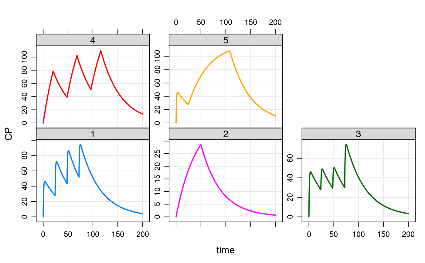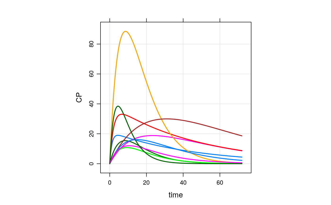 ## example("mrgsolve") mod <- mrgsolve::house(delta=0.1) %>% param(CL=0.5) events <- ev(amt=1000, cmt=1, addl=5, ii=24) events#> Events: #> time amt ii addl cmt evid #> 1 0 1000 24 5 1 1mod#> #> #> -------------- source: housemodel.cpp -------------- #> #> project: /data/GHE/mpn/de...solve/project #> shared object: mrgsolve #> #> time: start: 0 end: 120 delta: 0.1 #> add: <none> #> #> compartments: GUT CENT RESP [3] #> parameters: CL VC KA F1 D1 WT SEX WTCL WTVC SEXCL #> SEXVC KIN KOUT IC50 [14] #> captures: DV CP [2] #> omega: 4x4 #> sigma: 1x1 #> #> solver: atol: 1e-08 rtol: 1e-08 maxsteps: 20k #> ------------------------------------------------------see(mod)#> #> Model file: housemodel.cpp #> $PROB #> #> # `mrgsolve` housemodel #> #> This model is compiled with `mrgsolve`. #> #> - Author: Metrum Research Group, LLC #> - Description: Generic indirect response PK/PD model #> - Covariates: Weight, female sex #> - Random effects: CL, VC, KA, KOUT #> - Error model: exponential #> #> #> #> $PLUGIN base #> #> $PARAM @annotated #> CL : 1 : Clearance (L/hr) #> VC : 20 : Volume of distribution (L) #> KA : 1.2 : Absorption rate constant (1/hr) #> F1 : 1.0 : Bioavailability fraction (.) #> D1 : 2.0 : Infusion duration (hr) #> WT : 70 : Weight (kg) #> SEX : 0 : Covariate female sex #> WTCL : 0.75 : Exponent WT on CL #> WTVC : 1.00 : Exponent WT on VC #> SEXCL: 0.7 : Prop cov effect on CL #> SEXVC: 0.85 : Prop cov effect on VC #> KIN : 100 : Resp prod rate constant (1/hr) #> KOUT : 2 : Resp elim rate constant (1/hr) #> IC50 : 10 : Conc giving 50% max resp (ng/ml) #> #> $CMT @annotated #> GUT : Dosing compartment (mg) #> CENT : Central compartment (mg) #> RESP : Response (unitless) #> #> $OMEGA @labels ECL EVC EKA EKOUT #> 0 0 0 0 #> #> $SIGMA @labels EXPO #> 0 #> #> $SET end=120, delta=0.25 #> #> #> $GLOBAL #> #define CP (CENT/VCi) #> #define INH (CP/(IC50+CP)) #> #> typedef double localdouble; #> #> $MAIN #> F_GUT = F1; #> D_CENT = D1; #> #> double CLi = exp(log(CL) + WTCL*log(WT/70) + log(SEXCL)*SEX + ECL); #> double VCi = exp(log(VC) + WTVC*log(WT/70) + log(SEXVC)*SEX + EVC); #> double KAi = exp(log(KA) + EKA); #> double KOUTi = exp(log(KOUT) + EKOUT); #> #> RESP_0 = KIN/KOUTi; #> #> $ODE #> dxdt_GUT = -KAi*GUT; #> dxdt_CENT = KAi*GUT - (CLi/VCi)*CENT; #> dxdt_RESP = KIN*(1-INH) - KOUTi*RESP; #> #> $TABLE #> double DV = CP*exp(EXPO); #> #> $CAPTURE @annotated #> DV: Dependent variable (ng/ml) #> CP: Plasma concentration (ng/ml) #>#> #> Model parameters (N=14): #> name value . name value #> CL 0.5 | SEX 0 #> D1 2 | SEXCL 0.7 #> F1 1 | SEXVC 0.85 #> IC50 10 | VC 20 #> KA 1.2 | WT 70 #> KIN 100 | WTCL 0.75 #> KOUT 2 | WTVC 1init(mod)#> #> Model initial conditions (N=3): #> name value . name value #> CENT (2) 0 | RESP (3) 50 #> GUT (1) 0 | . ... .#> ID time GUT CENT RESP DV CP #> 1 1 0.0 0.0000 0.0000 50.00000 0.000000 0.000000 #> 2 1 0.0 1000.0000 0.0000 50.00000 0.000000 0.000000 #> 3 1 0.1 886.9204 112.9355 48.03655 5.646775 5.646775 #> 4 1 0.2 786.6279 212.8183 44.31899 10.640917 10.640917 #> 5 1 0.3 697.6763 301.1252 40.24379 15.056258 15.056258 #> 6 1 0.4 618.7834 379.1657 36.29753 18.958286 18.958286tail(out)#> ID time GUT CENT RESP DV CP #> 1677 1 167.5 1.218837e-22 671.4739 11.36504 33.57369 33.57369 #> 1678 1 167.6 1.077787e-22 669.7973 11.38701 33.48987 33.48987 #> 1679 1 167.7 9.538416e-23 668.1249 11.40901 33.40625 33.40625 #> 1680 1 167.8 8.441717e-23 666.4567 11.43104 33.32283 33.32283 #> 1681 1 167.9 7.466550e-23 664.7926 11.45310 33.23963 33.23963 #> 1682 1 168.0 6.610142e-23 663.1327 11.47519 33.15664 33.15664dim(out)#> [1] 1682 7#> 'data.frame': 1 obs. of 7 variables: #> $ ID : num 1 #> $ time: num 72 #> $ GUT : num 1000 #> $ CENT: num 1037 #> $ RESP: num 8 #> $ DV : num 51.8 #> $ CP : num 51.8idata <- data.frame(ID=c(1,2,3), CL=c(0.5,1,2),VC=12) out <- mod %>% ev(events) %>% mrgsim(end=168, idata=idata, req="") plot(out)#> ID time evid amt cmt GUT CENT RESP DV CP #> 1 1 0.0 0 0 0 0.0000 0.0000 50.00000 0.000000 0.000000 #> 2 1 0.0 1 1000 1 1000.0000 0.0000 50.00000 0.000000 0.000000 #> 3 1 0.1 0 0 0 886.9204 112.9355 48.03655 5.646775 5.646775 #> 4 1 0.2 0 0 0 786.6279 212.8183 44.31899 10.640917 10.640917 #> 5 1 0.3 0 0 0 697.6763 301.1252 40.24379 15.056258 15.056258 #> 6 1 0.4 0 0 0 618.7834 379.1657 36.29753 18.958286 18.958286ev1 <- ev(amt=500, cmt=2,rate=10) ev2 <- ev(amt=100, cmt=1, time=54, ii=8, addl=10) events <- c(ev1+ev2) events#> Events: #> time amt rate cmt evid ii addl #> 1 0 500 10 2 1 0 0 #> 2 54 100 0 1 1 8 10#> ID amt cmt time addl ii rate evid #> 1 1 1000 1 0 3 24 0 1 #> 2 2 1000 2 0 0 0 20 1 #> 3 3 1000 1 0 0 0 0 1 #> 4 3 500 1 24 0 0 0 1 #> 5 3 500 1 48 0 0 0 1 #> 6 3 1000 1 72 0 0 0 1 #> 7 4 2000 2 0 2 48 100 1 #> 8 5 1000 1 0 0 0 0 1 #> 9 5 5000 1 24 0 0 60 1## idata data(exidata) out <- mod %>% ev(amt=1000, cmt=1) %>% idata_set(exidata) %>% mrgsim(end=72) plot(out, CP~., as="log10")