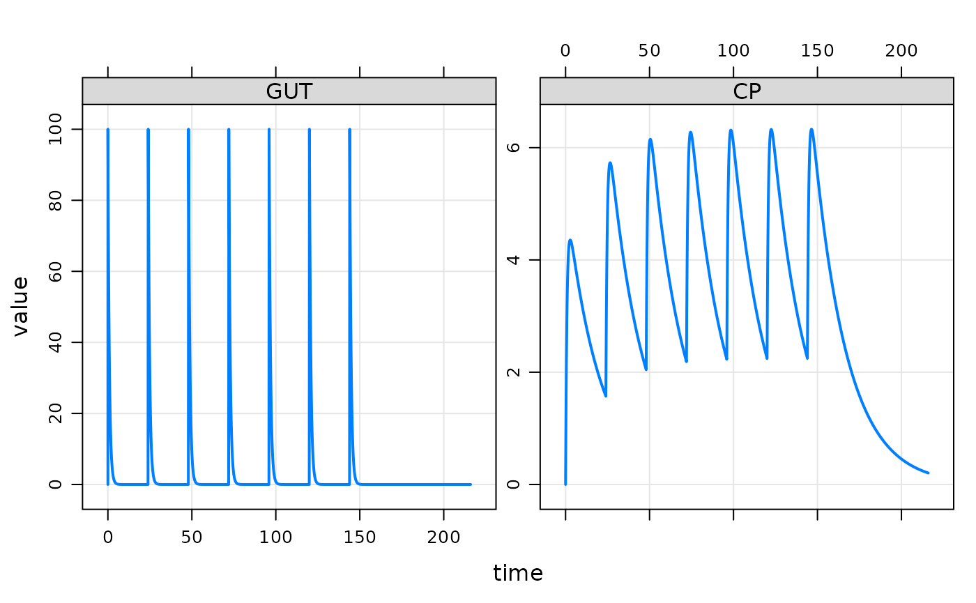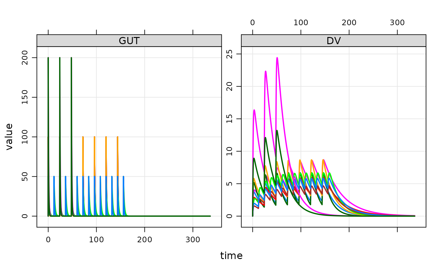 We can implement this series of doses by passing e in as the events argument to mrgsim