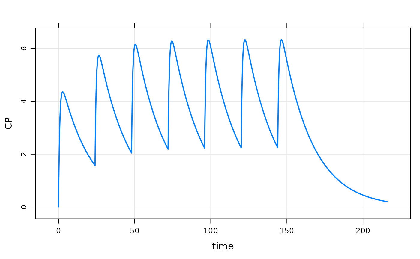 e <- ev(amt = 100, ii = 24, addl = 6)This will implement 100 unit doses every 24 hours for a total of 7 doses. e has class ev, but really it is just a data frame