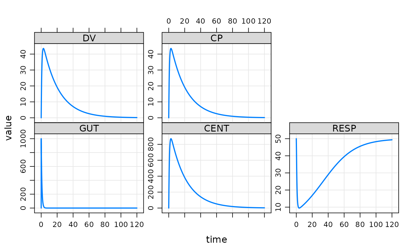 ## example("mrgsim") e <- ev(amt = 1000) mod <- mrgsolve::house() out <- mod %>% ev(e) %>% mrgsim() plot(out)#> Model: housemodel #> Dim: 90 x 7 #> Time: 0 to 22 #> ID: 1 #> ID time GUT CENT RESP DV CP #> 1: 1 0.00 0.0 0.0 50.00 0.00 0.00 #> 2: 1 0.00 1000.0 0.0 50.00 0.00 0.00 #> 3: 1 0.25 740.8 257.5 42.29 12.87 12.87 #> 4: 1 0.50 548.8 445.0 32.69 22.25 22.25 #> 5: 1 0.75 406.6 580.8 25.29 29.04 29.04 #> 6: 1 1.00 301.2 678.3 20.05 33.91 33.91 #> 7: 1 1.25 223.1 747.4 16.45 37.37 37.37 #> 8: 1 1.50 165.3 795.6 14.01 39.78 39.78#> Model: housemodel #> Dim: 132 x 7 #> Time: 0 to 24.65 #> ID: 12 #> ID time GUT CENT RESP DV CP #> 1: 1 0.00 4.020000 0.000 50.00 0.00000 0.00000 #> 2: 1 0.25 2.978089 1.035 49.95 0.04552 0.04552 #> 3: 1 0.57 2.028470 1.961 49.81 0.08624 0.08624 #> 4: 1 1.12 1.048417 2.875 49.57 0.12643 0.12643 #> 5: 1 2.02 0.356038 3.428 49.33 0.15072 0.15072 #> 6: 1 3.82 0.041060 3.439 49.25 0.15121 0.15121 #> 7: 1 5.10 0.008838 3.263 49.28 0.14348 0.14348 #> 8: 1 7.03 0.000872 2.980 49.34 0.13101 0.13101out <- mod %>% mrgsim(data=exTheoph) out <- mrgsim(mod, data=exTheoph, obsonly=TRUE) out#> Model: housemodel #> Dim: 120 x 7 #> Time: 0.25 to 24.65 #> ID: 12 #> ID time GUT CENT RESP DV CP #> 1: 1 0.25 2.978e+00 1.035 49.95 0.04552 0.04552 #> 2: 1 0.57 2.028e+00 1.961 49.81 0.08624 0.08624 #> 3: 1 1.12 1.048e+00 2.875 49.57 0.12643 0.12643 #> 4: 1 2.02 3.560e-01 3.428 49.33 0.15072 0.15072 #> 5: 1 3.82 4.106e-02 3.439 49.25 0.15121 0.15121 #> 6: 1 5.10 8.838e-03 3.263 49.28 0.14348 0.14348 #> 7: 1 7.03 8.720e-04 2.980 49.34 0.13101 0.13101 #> 8: 1 9.05 7.723e-05 2.703 49.40 0.11884 0.11884out <- mod %>% mrgsim(data=exTheoph, obsaug=TRUE, carry_out="a.u.g") out#> Model: housemodel #> Dim: 5904 x 8 #> Time: 0 to 120 #> ID: 12 #> ID time a.u.g GUT CENT RESP DV CP #> 1: 1 0.00 1 0.000 0.000 50.00 0.00000 0.00000 #> 2: 1 0.00 0 4.020 0.000 50.00 0.00000 0.00000 #> 3: 1 0.25 1 2.978 1.035 49.95 0.04552 0.04552 #> 4: 1 0.25 0 2.978 1.035 49.95 0.04552 0.04552 #> 5: 1 0.50 1 2.206 1.790 49.84 0.07870 0.07870 #> 6: 1 0.57 0 2.028 1.961 49.81 0.08624 0.08624 #> 7: 1 0.75 1 1.634 2.337 49.73 0.10274 0.10274 #> 8: 1 1.00 1 1.211 2.729 49.61 0.12001 0.12001#> Model: housemodel #> Dim: 482 x 4 #> Time: 0 to 120 #> ID: 1 #> ID time RESP CP #> 1: 1 0.00 50.00 0.00 #> 2: 1 0.00 50.00 0.00 #> 3: 1 0.25 42.29 12.87 #> 4: 1 0.50 32.69 22.25 #> 5: 1 0.75 25.29 29.04 #> 6: 1 1.00 20.05 33.91 #> 7: 1 1.25 16.45 37.37 #> 8: 1 1.50 14.01 39.78a <- ev(amt = 1000, group = 'a') b <- ev(amt = 750, group = 'b') data <- as_data_set(a,b) out <- mrgsim_d(mod, data, recover="group") out#> Model: housemodel #> Dim: 964 x 8 #> Time: 0 to 120 #> ID: 2 #> ID time GUT CENT RESP DV CP group #> 1: 1 0.00 0.0 0.0 50.00 0.00 0.00 a #> 2: 1 0.00 1000.0 0.0 50.00 0.00 0.00 a #> 3: 1 0.25 740.8 257.5 42.29 12.87 12.87 a #> 4: 1 0.50 548.8 445.0 32.69 22.25 22.25 a #> 5: 1 0.75 406.6 580.8 25.29 29.04 29.04 a #> 6: 1 1.00 301.2 678.3 20.05 33.91 33.91 a #> 7: 1 1.25 223.1 747.4 16.45 37.37 37.37 a #> 8: 1 1.50 165.3 795.6 14.01 39.78 39.78 a