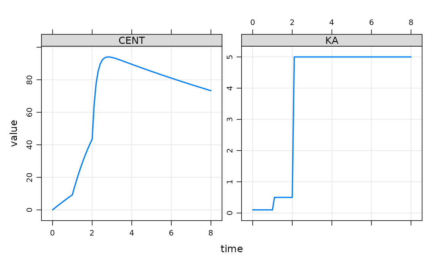 mod %>% ev(amt=100) %>% mrgsim(delta = 0.222) %>% plot(CENT+KA~time)