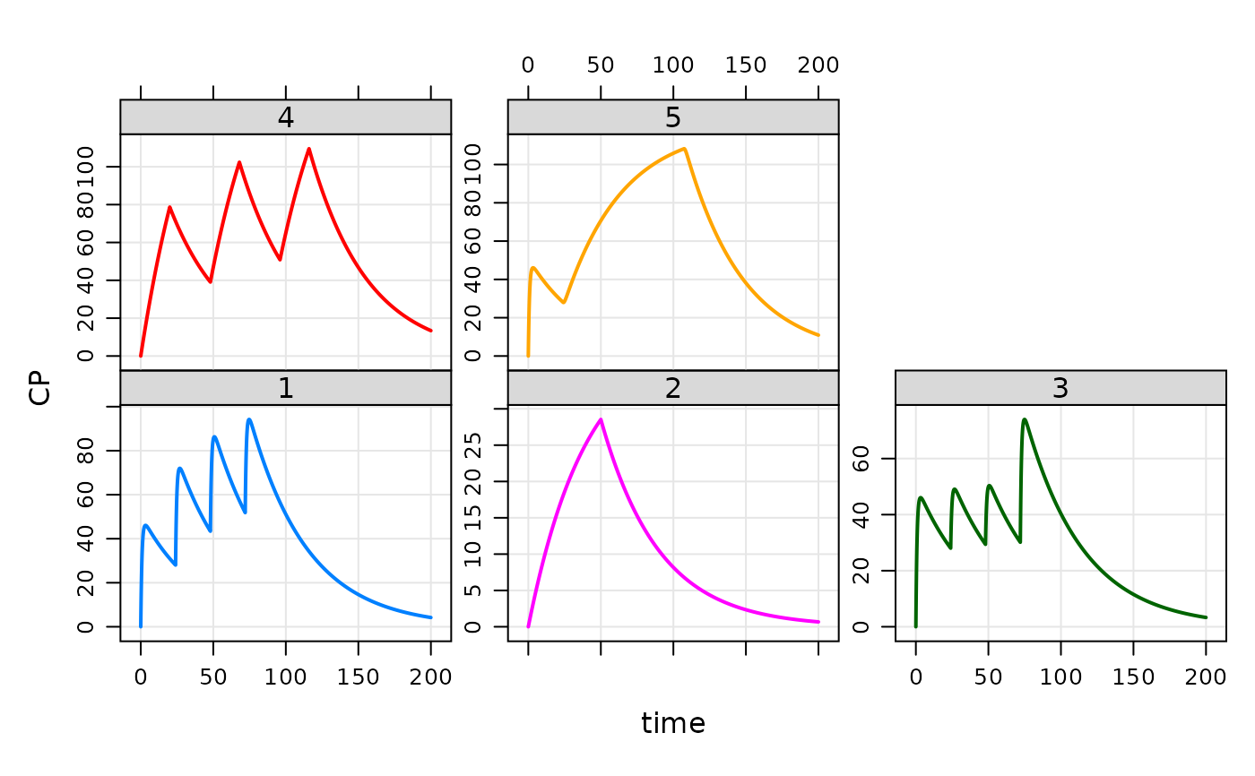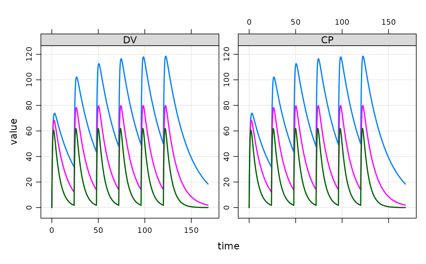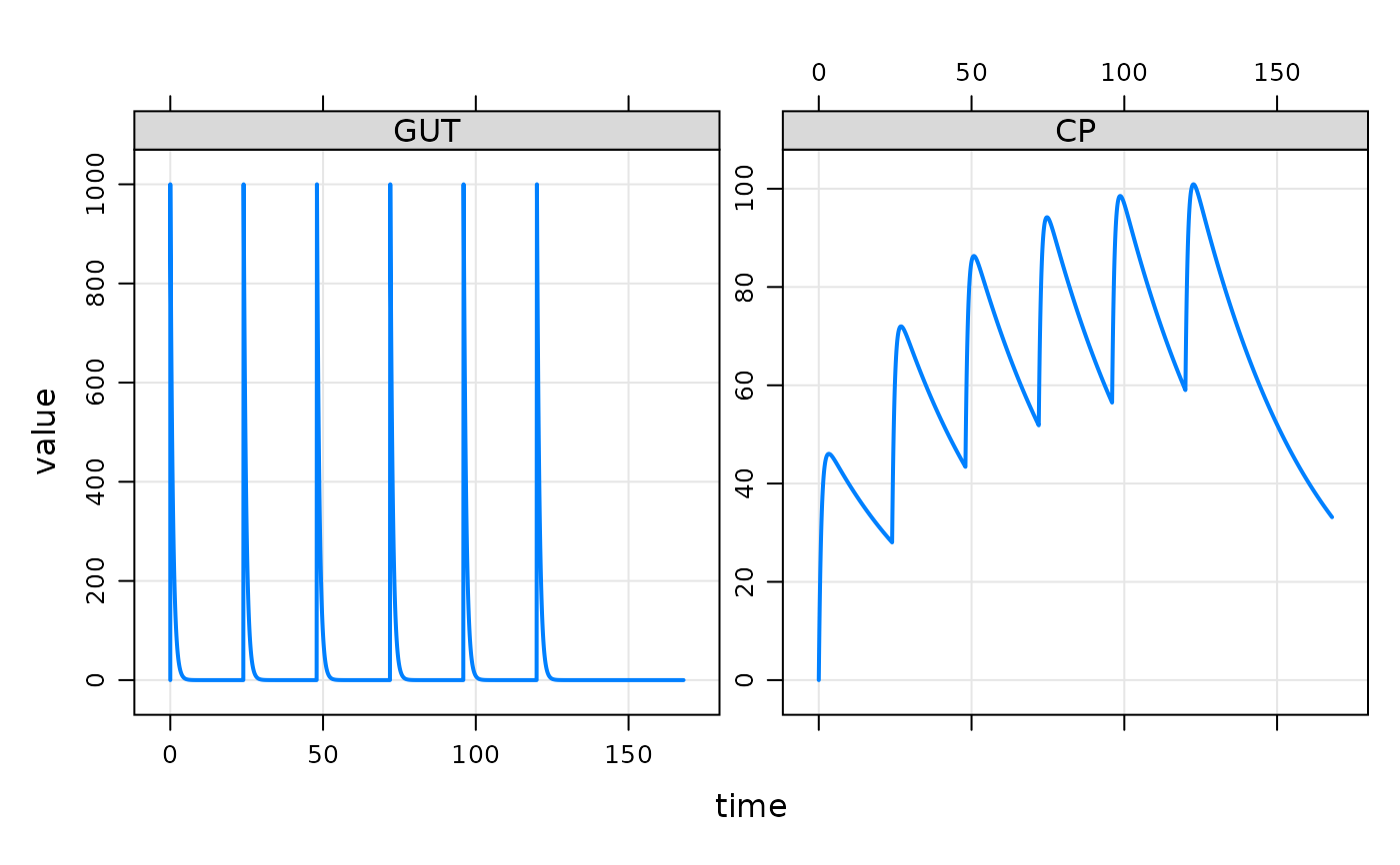 ## example("mrgsolve") mod <- mrgsolve::house(delta=0.1) %>% param(CL=0.5) events <- ev(amt=1000, cmt=1, addl=5, ii=24) events#> Events: #> time amt ii addl cmt evid #> 1 0 1000 24 5 1 1mod#> #> #> -------------- source: housemodel.cpp -------------- #> #> project: /data/GHE/deploy...solve/project #> shared object: mrgsolve #> #> time: start: 0 end: 120 delta: 0.1 #> add: <none> #> #> compartments: GUT CENT RESP [3] #> parameters: CL VC KA F1 D1 WT SEX WTCL WTVC SEXCL #> SEXVC KIN KOUT IC50 [14] #> captures: DV CP [2] #> omega: 4x4 #> sigma: 1x1 #> #> solver: atol: 1e-08 rtol: 1e-08 maxsteps: 20k #> ------------------------------------------------------#> #> Model file: housemodel.cpp #> $PROB #> #> # `mrgsolve` housemodel #> #> This model is compiled with `mrgsolve`. #> #> - Author: Metrum Research Group, LLC #> - Description: Generic indirect response PK/PD model #> - Covariates: Weight, female sex #> - Random effects: CL, VC, KA, KOUT #> - Error model: exponential #> #> #> #> $PLUGIN base #> #> $PARAM @annotated #> CL : 1 : Clearance (L/hr) #> VC : 20 : Volume of distribution (L) #> KA : 1.2 : Absorption rate constant (1/hr) #> F1 : 1.0 : Bioavailability fraction (.) #> D1 : 2.0 : Infusion duration (hr) #> WT : 70 : Weight (kg) #> SEX : 0 : Covariate female sex #> WTCL : 0.75 : Exponent WT on CL #> WTVC : 1.00 : Exponent WT on VC #> SEXCL: 0.7 : Prop cov effect on CL #> SEXVC: 0.85 : Prop cov effect on VC #> KIN : 100 : Resp prod rate constant (1/hr) #> KOUT : 2 : Resp elim rate constant (1/hr) #> IC50 : 10 : Conc giving 50% max resp (ng/ml) #> #> $CMT @annotated #> GUT : Dosing compartment (mg) #> CENT : Central compartment (mg) #> RESP : Response (unitless) #> #> $OMEGA @labels ECL EVC EKA EKOUT #> 0 0 0 0 #> #> $SIGMA @labels EXPO #> 0 #> #> $SET end=120, delta=0.25 #> #> #> $GLOBAL #> #define CP (CENT/VCi) #> #define INH (CP/(IC50+CP)) #> #> typedef double localdouble; #> #> $MAIN #> F_GUT = F1; #> D_CENT = D1; #> #> double CLi = exp(log(CL) + WTCL*log(WT/70) + log(SEXCL)*SEX + ECL); #> double VCi = exp(log(VC) + WTVC*log(WT/70) + log(SEXVC)*SEX + EVC); #> double KAi = exp(log(KA) + EKA); #> double KOUTi = exp(log(KOUT) + EKOUT); #> #> RESP_0 = KIN/KOUTi; #> #> $ODE #> dxdt_GUT = -KAi*GUT; #> dxdt_CENT = KAi*GUT - (CLi/VCi)*CENT; #> dxdt_RESP = KIN*(1-INH) - KOUTi*RESP; #> #> $TABLE #> double DV = CP*exp(EXPO); #> #> $CAPTURE @annotated #> DV: Dependent variable (ng/ml) #> CP: Plasma concentration (ng/ml) #>#> #> Model parameters (N=14): #> name value . name value #> CL 0.5 | SEX 0 #> D1 2 | SEXCL 0.7 #> F1 1 | SEXVC 0.85 #> IC50 10 | VC 20 #> KA 1.2 | WT 70 #> KIN 100 | WTCL 0.75 #> KOUT 2 | WTVC 1#> #> Model initial conditions (N=3): #> name value . name value #> CENT (2) 0 | RESP (3) 50 #> GUT (1) 0 | . ... .#> ID time GUT CENT RESP DV CP #> 1 1 0.0 0.0000 0.0000 50.00000 0.000000 0.000000 #> 2 1 0.0 1000.0000 0.0000 50.00000 0.000000 0.000000 #> 3 1 0.1 886.9204 112.9355 48.03655 5.646775 5.646775 #> 4 1 0.2 786.6279 212.8183 44.31899 10.640917 10.640917 #> 5 1 0.3 697.6763 301.1252 40.24379 15.056258 15.056258 #> 6 1 0.4 618.7834 379.1657 36.29753 18.958286 18.958286#> ID time GUT CENT RESP DV CP #> 1677 1 167.5 1.218837e-22 671.4739 11.36504 33.57369 33.57369 #> 1678 1 167.6 1.077787e-22 669.7973 11.38701 33.48987 33.48987 #> 1679 1 167.7 9.538416e-23 668.1249 11.40901 33.40625 33.40625 #> 1680 1 167.8 8.441717e-23 666.4567 11.43104 33.32283 33.32283 #> 1681 1 167.9 7.466550e-23 664.7926 11.45310 33.23963 33.23963 #> 1682 1 168.0 6.610142e-23 663.1327 11.47519 33.15664 33.15664#> [1] 1682 7#> 'data.frame': 1 obs. of 7 variables: #> $ ID : num 1 #> $ time: num 72 #> $ GUT : num 1000 #> $ CENT: num 1037 #> $ RESP: num 8 #> $ DV : num 51.8 #> $ CP : num 51.8idata <- data.frame(ID=c(1,2,3), CL=c(0.5,1,2),VC=12) out <- mod %>% ev(events) %>% mrgsim(end=168, idata=idata, req="") plot(out)#> ID time evid amt cmt GUT CENT RESP DV CP #> 1 1 0.0 0 0 0 0.0000 0.0000 50.00000 0.000000 0.000000 #> 2 1 0.0 1 1000 1 1000.0000 0.0000 50.00000 0.000000 0.000000 #> 3 1 0.1 0 0 0 886.9204 112.9355 48.03655 5.646775 5.646775 #> 4 1 0.2 0 0 0 786.6279 212.8183 44.31899 10.640917 10.640917 #> 5 1 0.3 0 0 0 697.6763 301.1252 40.24379 15.056258 15.056258 #> 6 1 0.4 0 0 0 618.7834 379.1657 36.29753 18.958286 18.958286ev1 <- ev(amt=500, cmt=2,rate=10) ev2 <- ev(amt=100, cmt=1, time=54, ii=8, addl=10) events <- c(ev1+ev2) events#> Events: #> time amt rate cmt evid ii addl #> 1 0 500 10 2 1 0 0 #> 2 54 100 0 1 1 8 10#> ID amt cmt time addl ii rate evid #> 1 1 1000 1 0 3 24 0 1 #> 2 2 1000 2 0 0 0 20 1 #> 3 3 1000 1 0 0 0 0 1 #> 4 3 500 1 24 0 0 0 1 #> 5 3 500 1 48 0 0 0 1 #> 6 3 1000 1 72 0 0 0 1 #> 7 4 2000 2 0 2 48 100 1 #> 8 5 1000 1 0 0 0 0 1 #> 9 5 5000 1 24 0 0 60 1## idata data(exidata) out <- mod %>% ev(amt=1000, cmt=1) %>% idata_set(exidata) %>% mrgsim(end=72) plot(out, CP~., as="log10")