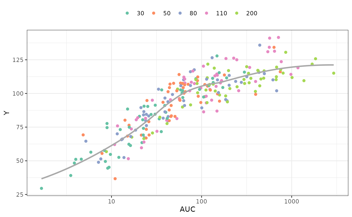 ggplot(out, aes(AUC, Y, col =factor(DOSE))) +