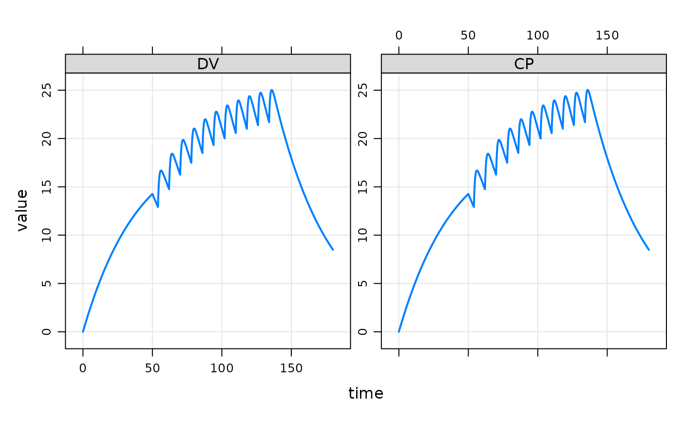 out <- mod %>% ev(events) %>% mrgsim(end=180, req="")