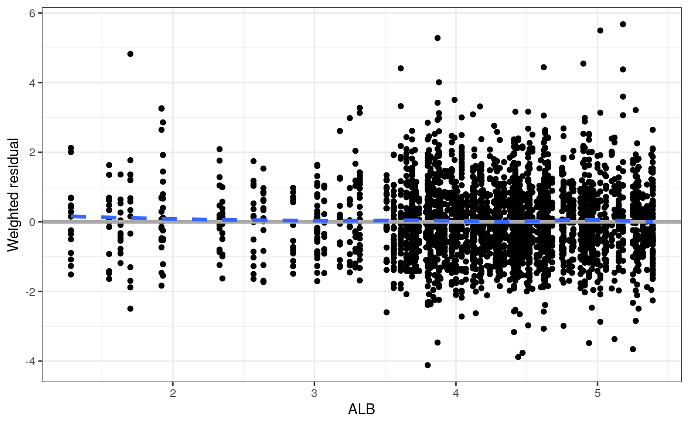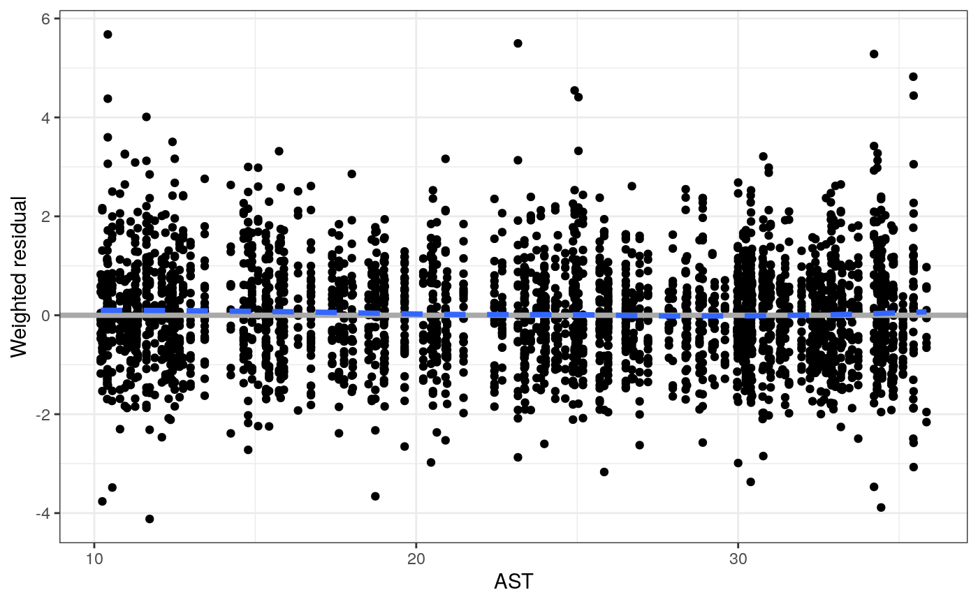 If we wanted to vectorize this plot and look at WRES versus WT, ALB, CRCL, and AST we would write