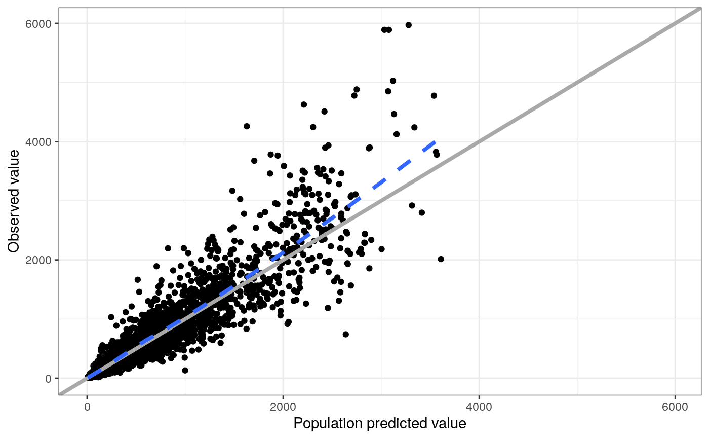 dv_pred(df, x = pm_axis_pred(), y = pm_axis_dv(), yname = "value", xname = "value", xs = list(), ys = list(), loglog = FALSE, scales = c("fixed", "free"), ...) dv_ipred(df, x = pm_axis_ipred(), ...) dv_preds(df, ...)