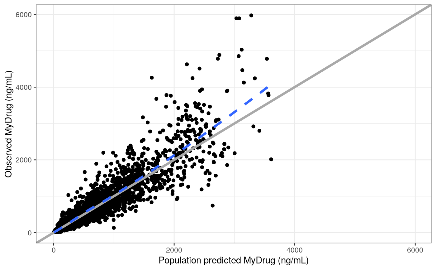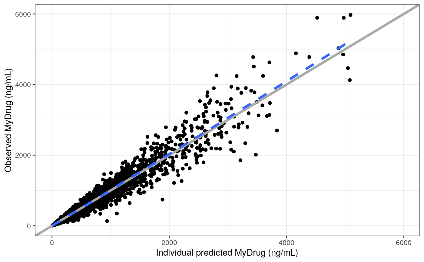 dv_ipred(df, yname="MyDrug (ng/mL)")dv_preds(df, yname = "MyDrug (ng/mL)")#> [[1]]#> #> [[2]]#>