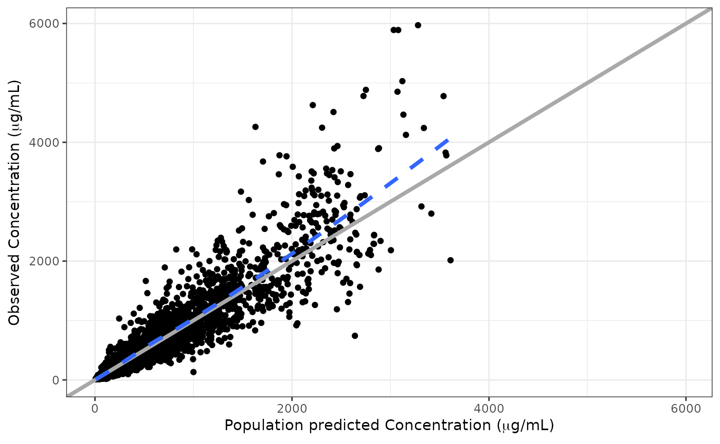 dv_pred(pmplots_data_obs(), yname = "Concentration ($\\mu$g/mL)")## Loading required namespace: latex2exp