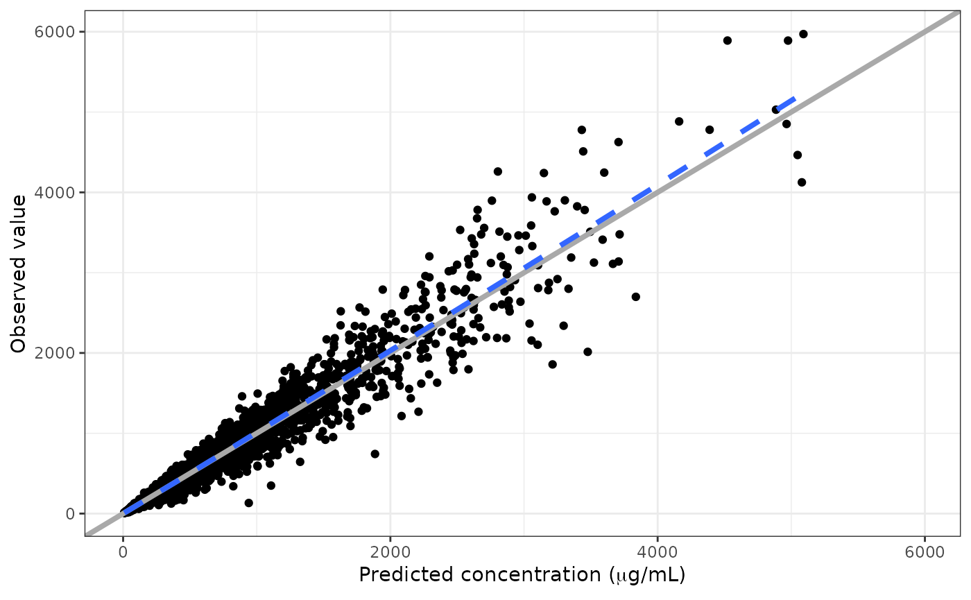 dv_pred(data, x = "IPRED//Predicted concentration ($\\mu$g/mL)")## Loading required namespace: latex2exp