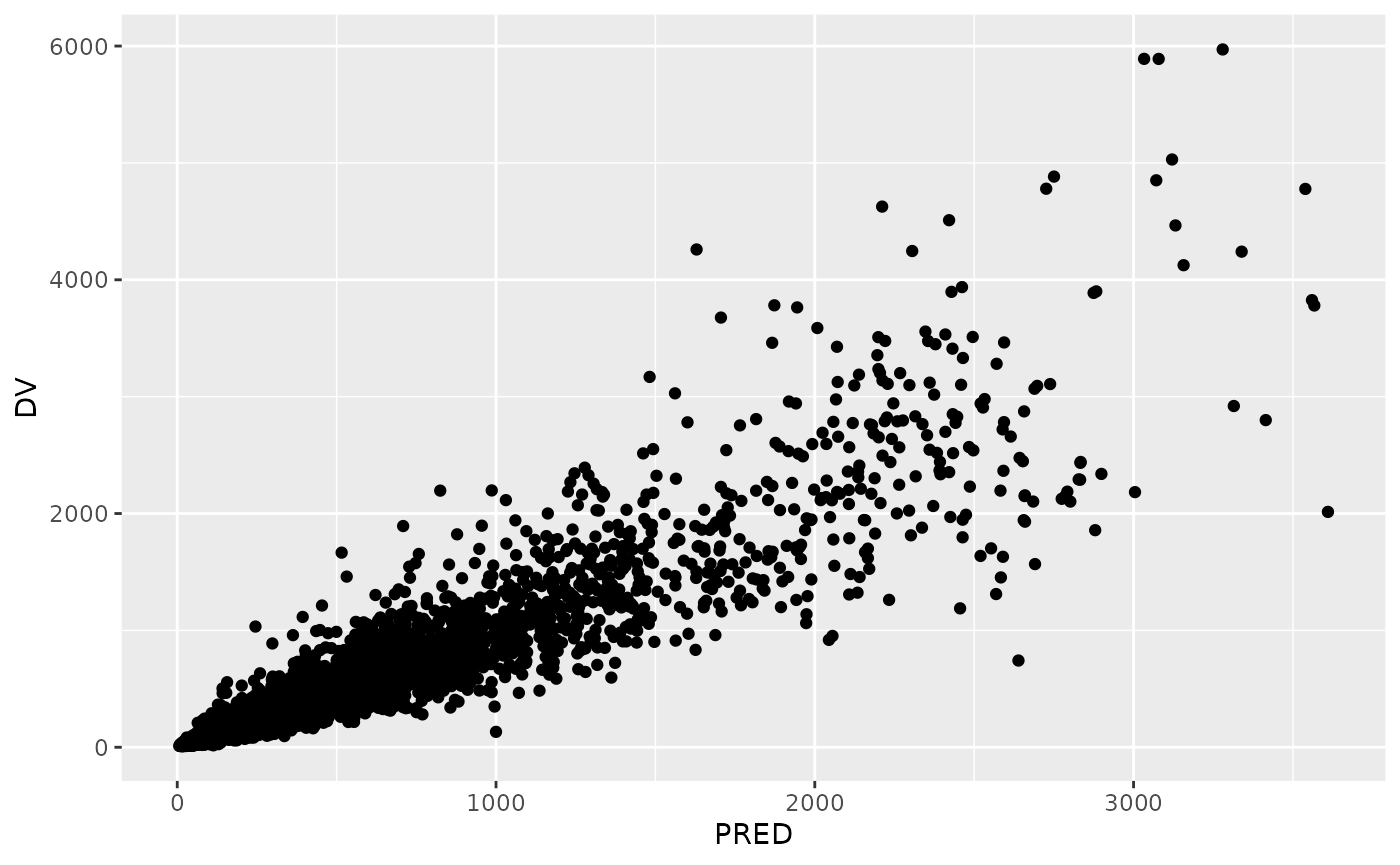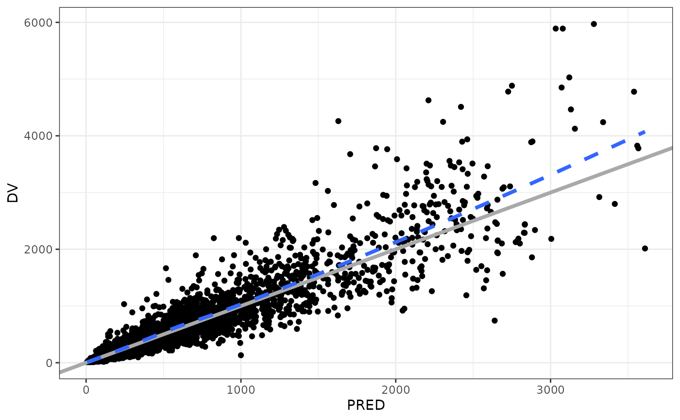 dv_pred(data, x = "IPRED//!!'Predicted concentration (' * mu * 'g/mL)'")## `geom_smooth()` using formula 'y ~ x'