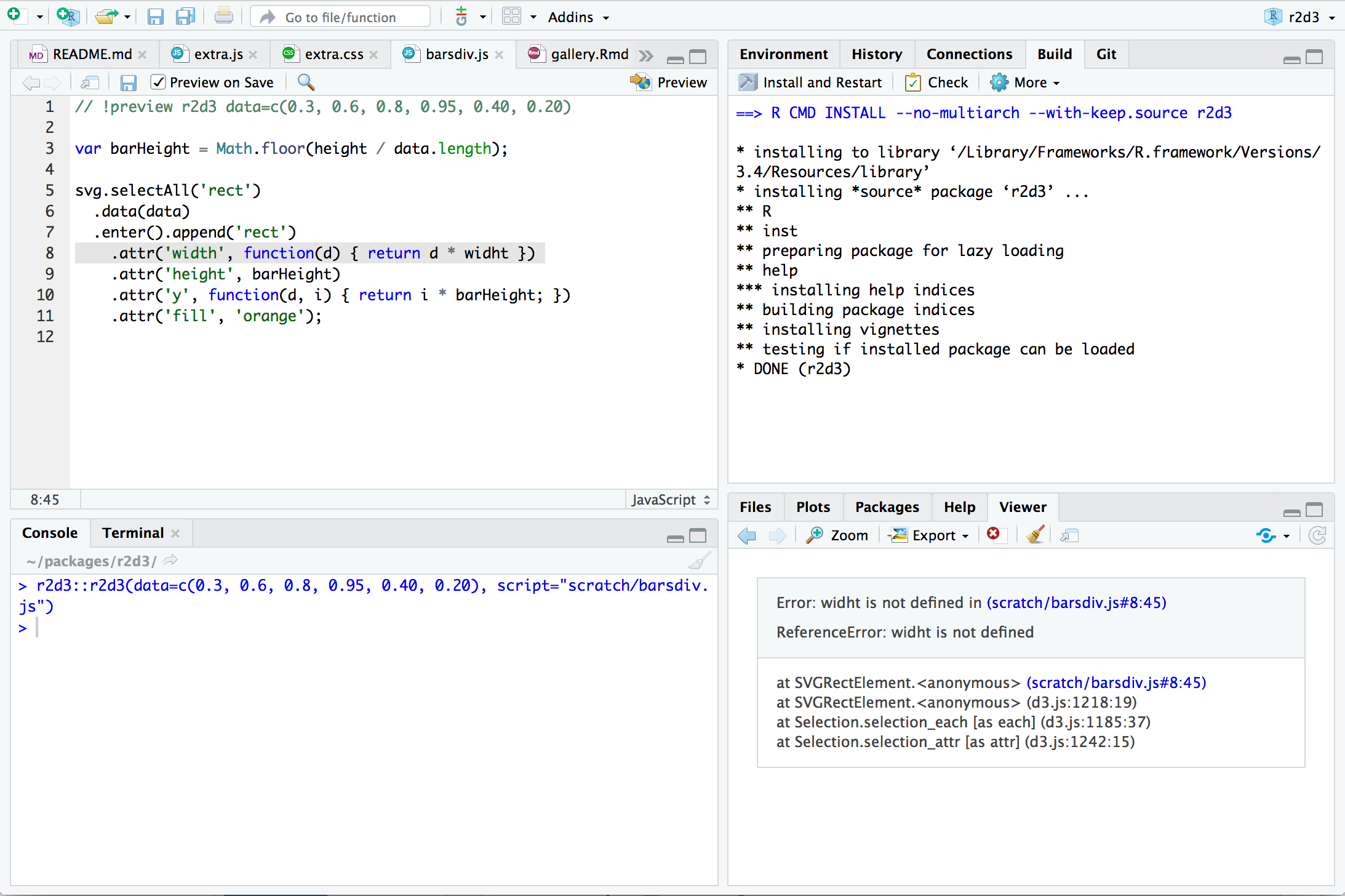.attr('fill', 'steelblue');r2d3 renders renders the JavaScript console output directly into the visualization. For this example, this will show that the width is 0.2, which is too small to be visible: