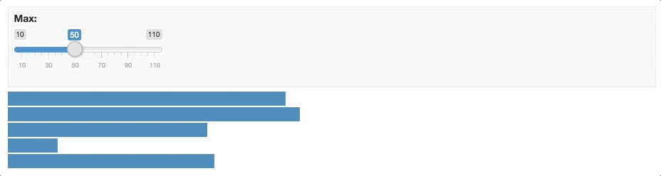 This example shows a Shiny app that modifies a D3 plot’s bar length based on the value that the user chooses for the sliderInput():