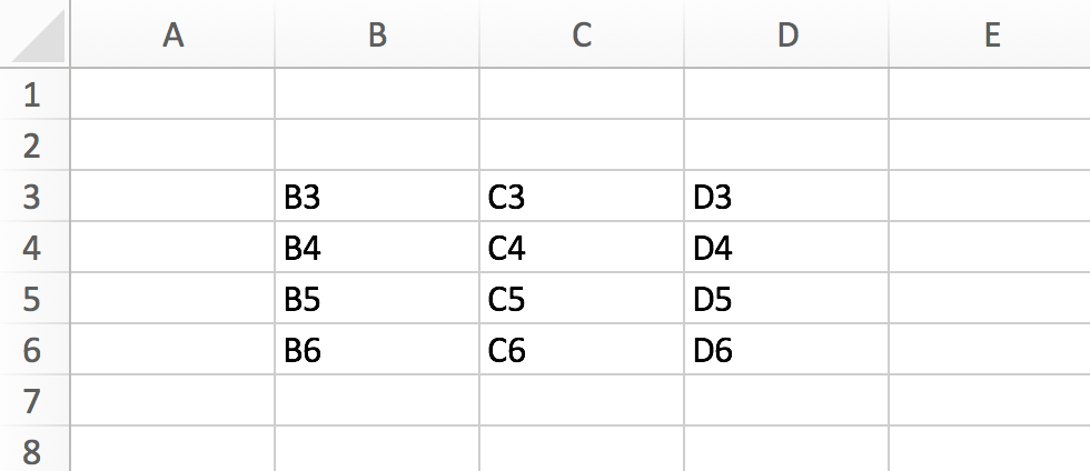 Here we get a 3 by 4 rectangle with cell C5 as the upper left corner: