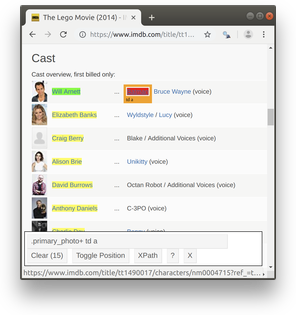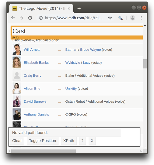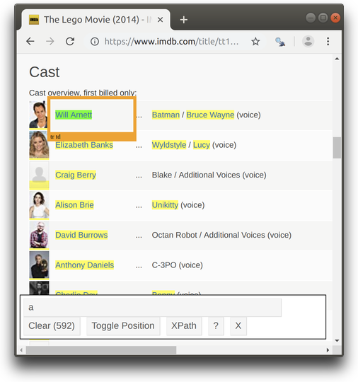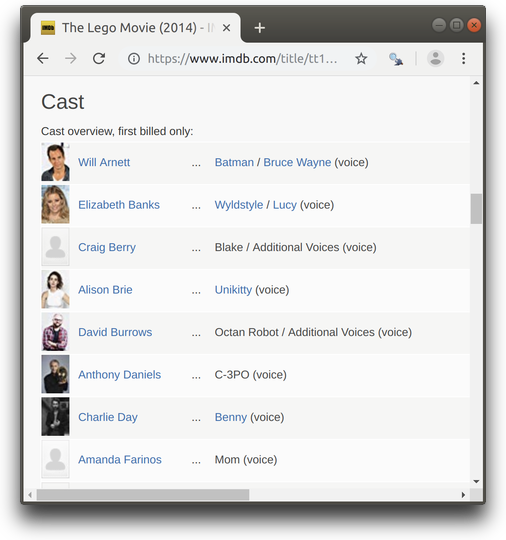 For example, imagine we want to find the actors listed on an IMDB movie page, e.g. The Lego Movie.