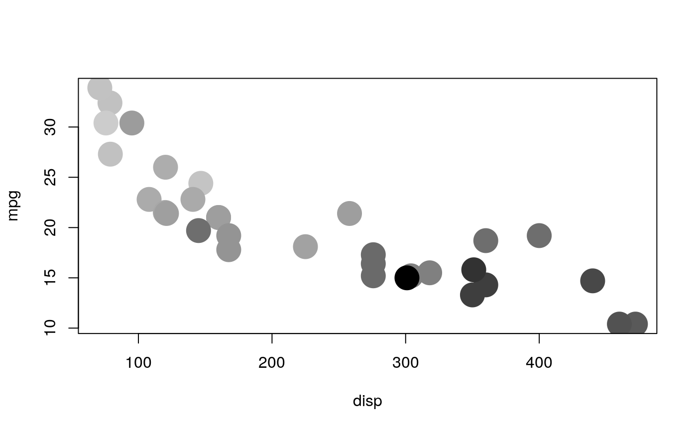 with(mtcars, plot(disp, mpg, pch = 20, cex = 5, col = cscale(hp, seq_gradient_pal("grey80", "black"))))
