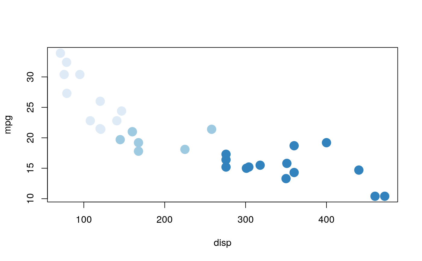 with(mtcars, plot(disp, mpg, pch = 20, cex = 3, col = dscale(factor(cyl), brewer_pal())))