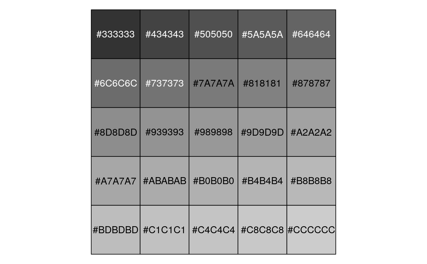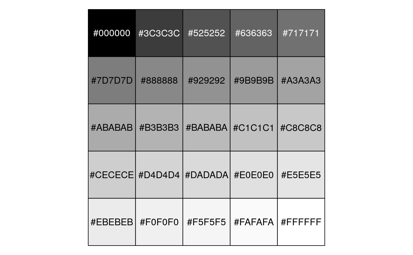 show_col(grey_pal()(25))show_col(grey_pal(0, 1)(25))