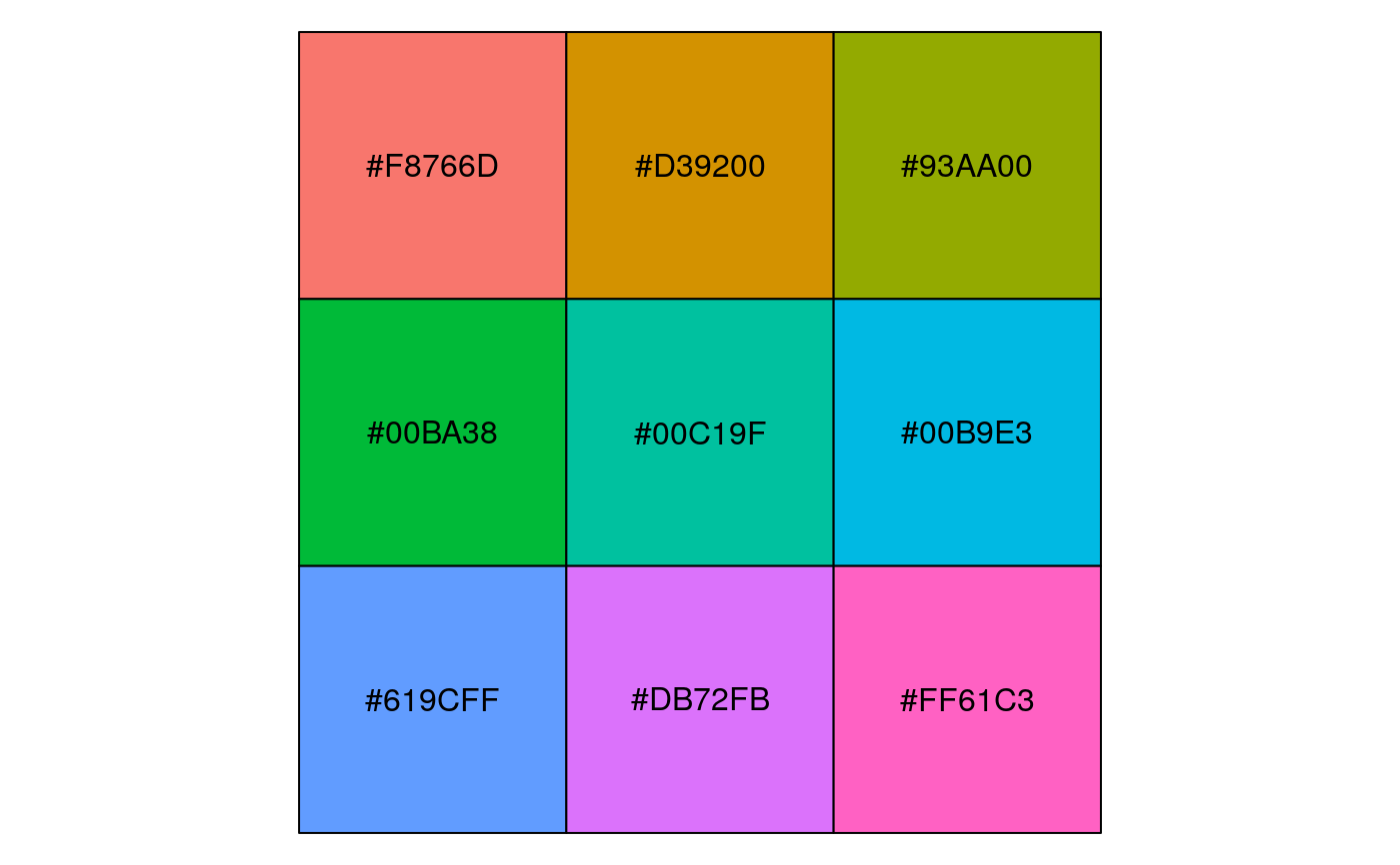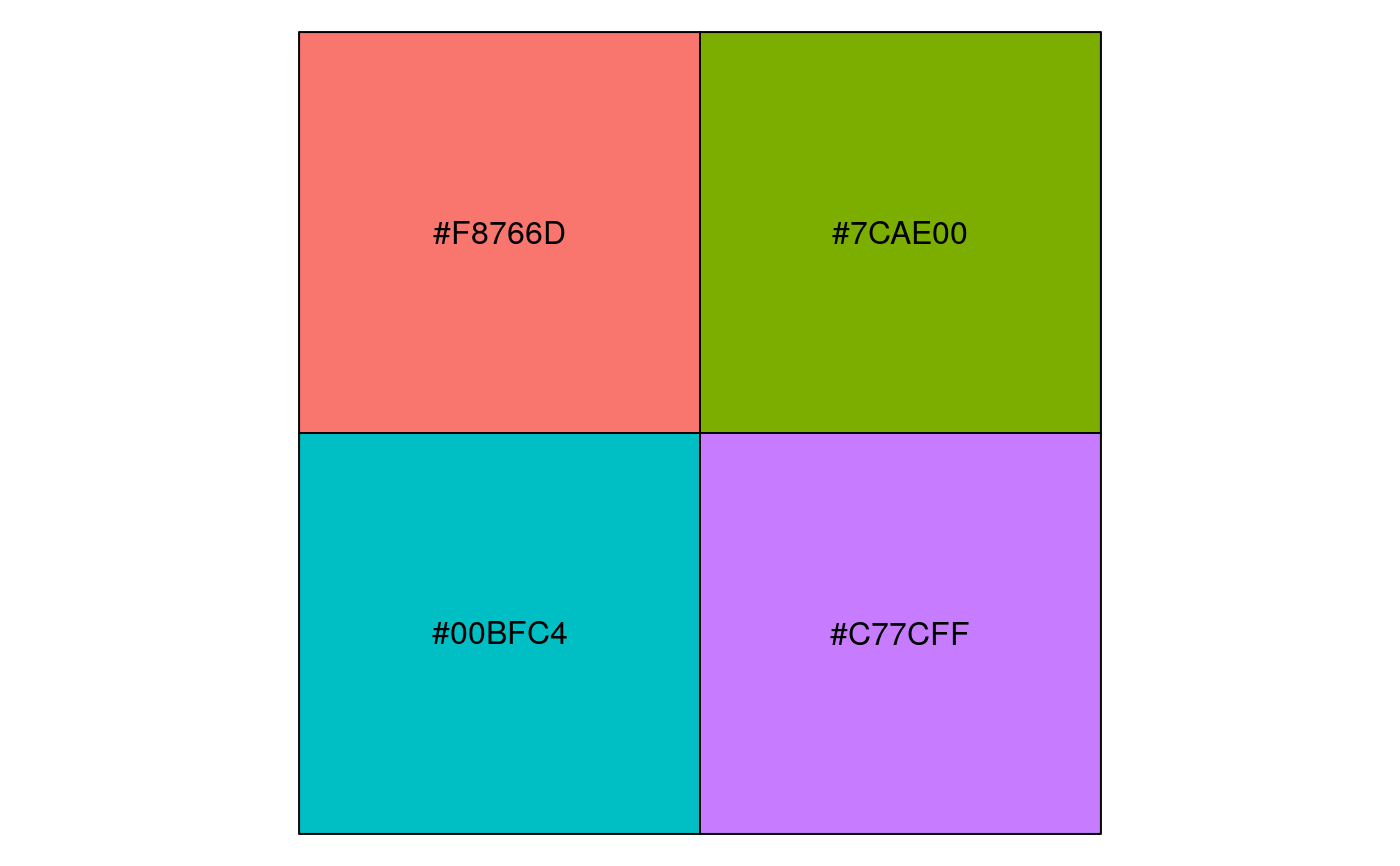 hue_pal(h = c(0, 360) + 15, c = 100, l = 65, h.start = 0, direction = 1)