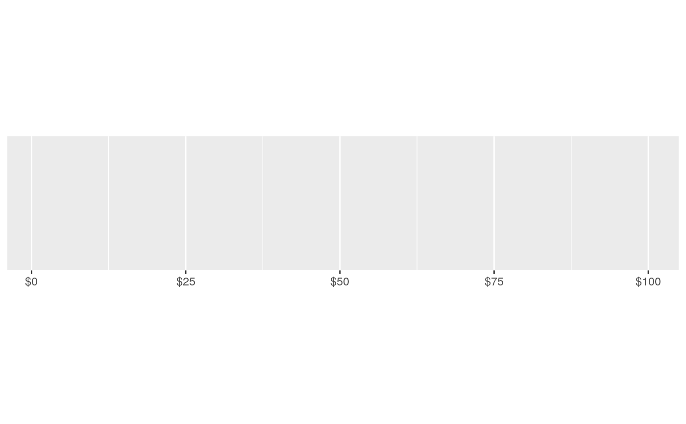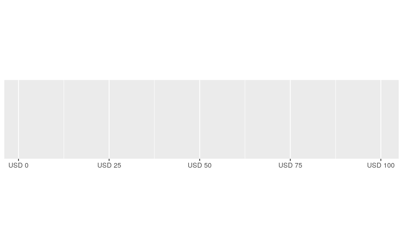 #> scale_x_continuous(labels = label_dollar())#> scale_x_continuous(labels = label_dollar())# Customise currency display with prefix and suffix demo_continuous(c(1, 100), labels = label_dollar(prefix = "USD "))#> scale_x_continuous(labels = label_dollar(prefix = "USD "))euro <- dollar_format( prefix = "", suffix = "\u20ac", big.mark = ".", decimal.mark = "," ) demo_continuous(c(1000, 1100), labels = euro)#> scale_x_continuous(labels = euro)#> Warning: conversion failure on '1.000€' in 'mbcsToSbcs': dot substituted for <e2>#> Warning: conversion failure on '1.000€' in 'mbcsToSbcs': dot substituted for <82>#> Warning: conversion failure on '1.000€' in 'mbcsToSbcs': dot substituted for <ac>#> Warning: conversion failure on '1.025€' in 'mbcsToSbcs': dot substituted for <e2>#> Warning: conversion failure on '1.025€' in 'mbcsToSbcs': dot substituted for <82>#> Warning: conversion failure on '1.025€' in 'mbcsToSbcs': dot substituted for <ac>#> Warning: conversion failure on '1.050€' in 'mbcsToSbcs': dot substituted for <e2>#> Warning: conversion failure on '1.050€' in 'mbcsToSbcs': dot substituted for <82>#> Warning: conversion failure on '1.050€' in 'mbcsToSbcs': dot substituted for <ac>#> Warning: conversion failure on '1.075€' in 'mbcsToSbcs': dot substituted for <e2>#> Warning: conversion failure on '1.075€' in 'mbcsToSbcs': dot substituted for <82>#> Warning: conversion failure on '1.075€' in 'mbcsToSbcs': dot substituted for <ac>#> Warning: conversion failure on '1.100€' in 'mbcsToSbcs': dot substituted for <e2>#> Warning: conversion failure on '1.100€' in 'mbcsToSbcs': dot substituted for <82>#> Warning: conversion failure on '1.100€' in 'mbcsToSbcs': dot substituted for <ac>#> Warning: conversion failure on '1.000€' in 'mbcsToSbcs': dot substituted for <e2>#> Warning: conversion failure on '1.000€' in 'mbcsToSbcs': dot substituted for <82>#> Warning: conversion failure on '1.000€' in 'mbcsToSbcs': dot substituted for <ac>#> Warning: conversion failure on '1.025€' in 'mbcsToSbcs': dot substituted for <e2>#> Warning: conversion failure on '1.025€' in 'mbcsToSbcs': dot substituted for <82>#> Warning: conversion failure on '1.025€' in 'mbcsToSbcs': dot substituted for <ac>#> Warning: conversion failure on '1.050€' in 'mbcsToSbcs': dot substituted for <e2>#> Warning: conversion failure on '1.050€' in 'mbcsToSbcs': dot substituted for <82>#> Warning: conversion failure on '1.050€' in 'mbcsToSbcs': dot substituted for <ac>#> Warning: conversion failure on '1.075€' in 'mbcsToSbcs': dot substituted for <e2>#> Warning: conversion failure on '1.075€' in 'mbcsToSbcs': dot substituted for <82>#> Warning: conversion failure on '1.075€' in 'mbcsToSbcs': dot substituted for <ac>#> Warning: conversion failure on '1.100€' in 'mbcsToSbcs': dot substituted for <e2>#> Warning: conversion failure on '1.100€' in 'mbcsToSbcs': dot substituted for <82>#> Warning: conversion failure on '1.100€' in 'mbcsToSbcs': dot substituted for <ac>#> Warning: conversion failure on '1.000€' in 'mbcsToSbcs': dot substituted for <e2>#> Warning: conversion failure on '1.000€' in 'mbcsToSbcs': dot substituted for <82>#> Warning: conversion failure on '1.000€' in 'mbcsToSbcs': dot substituted for <ac>#> Warning: conversion failure on '1.025€' in 'mbcsToSbcs': dot substituted for <e2>#> Warning: conversion failure on '1.025€' in 'mbcsToSbcs': dot substituted for <82>#> Warning: conversion failure on '1.025€' in 'mbcsToSbcs': dot substituted for <ac>#> Warning: conversion failure on '1.050€' in 'mbcsToSbcs': dot substituted for <e2>#> Warning: conversion failure on '1.050€' in 'mbcsToSbcs': dot substituted for <82>#> Warning: conversion failure on '1.050€' in 'mbcsToSbcs': dot substituted for <ac>#> Warning: conversion failure on '1.075€' in 'mbcsToSbcs': dot substituted for <e2>#> Warning: conversion failure on '1.075€' in 'mbcsToSbcs': dot substituted for <82>#> Warning: conversion failure on '1.075€' in 'mbcsToSbcs': dot substituted for <ac>#> Warning: conversion failure on '1.100€' in 'mbcsToSbcs': dot substituted for <e2>#> Warning: conversion failure on '1.100€' in 'mbcsToSbcs': dot substituted for <82>#> Warning: conversion failure on '1.100€' in 'mbcsToSbcs': dot substituted for <ac>#> Warning: conversion failure on '1.000€' in 'mbcsToSbcs': dot substituted for <e2>#> Warning: conversion failure on '1.000€' in 'mbcsToSbcs': dot substituted for <82>#> Warning: conversion failure on '1.000€' in 'mbcsToSbcs': dot substituted for <ac>#> Warning: conversion failure on '1.025€' in 'mbcsToSbcs': dot substituted for <e2>#> Warning: conversion failure on '1.025€' in 'mbcsToSbcs': dot substituted for <82>#> Warning: conversion failure on '1.025€' in 'mbcsToSbcs': dot substituted for <ac>#> Warning: conversion failure on '1.050€' in 'mbcsToSbcs': dot substituted for <e2>#> Warning: conversion failure on '1.050€' in 'mbcsToSbcs': dot substituted for <82>#> Warning: conversion failure on '1.050€' in 'mbcsToSbcs': dot substituted for <ac>#> Warning: conversion failure on '1.075€' in 'mbcsToSbcs': dot substituted for <e2>#> Warning: conversion failure on '1.075€' in 'mbcsToSbcs': dot substituted for <82>#> Warning: conversion failure on '1.075€' in 'mbcsToSbcs': dot substituted for <ac>#> Warning: conversion failure on '1.100€' in 'mbcsToSbcs': dot substituted for <e2>#> Warning: conversion failure on '1.100€' in 'mbcsToSbcs': dot substituted for <82>#> Warning: conversion failure on '1.100€' in 'mbcsToSbcs': dot substituted for <ac>#> Warning: conversion failure on '1.000€' in 'mbcsToSbcs': dot substituted for <e2>#> Warning: conversion failure on '1.000€' in 'mbcsToSbcs': dot substituted for <82>#> Warning: conversion failure on '1.000€' in 'mbcsToSbcs': dot substituted for <ac>#> Warning: conversion failure on '1.025€' in 'mbcsToSbcs': dot substituted for <e2>#> Warning: conversion failure on '1.025€' in 'mbc