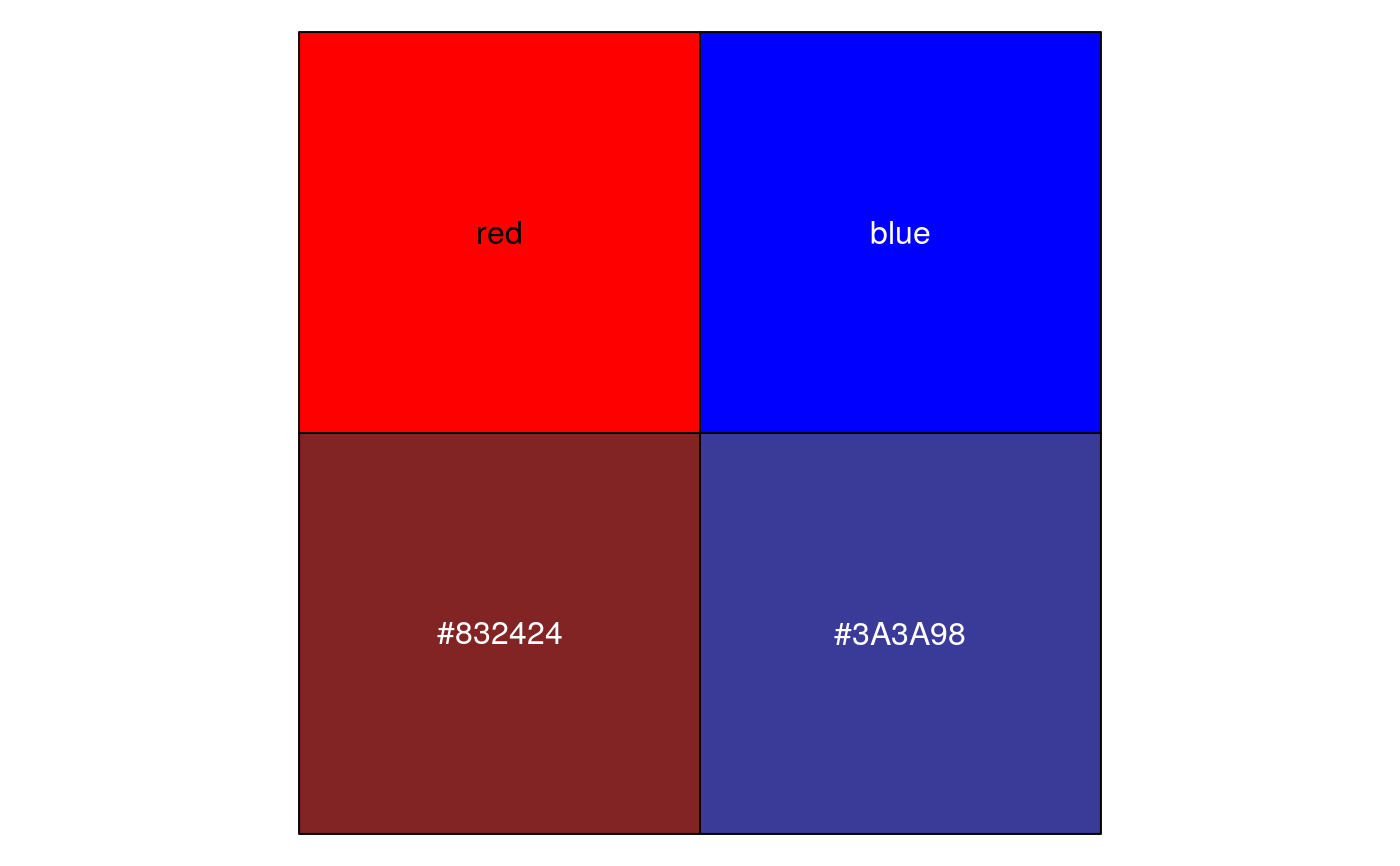 muted("red")#> [1] "#832424"muted("blue")#> [1] "#3A3A98"show_col(c("red", "blue", muted("red"), muted("blue")))