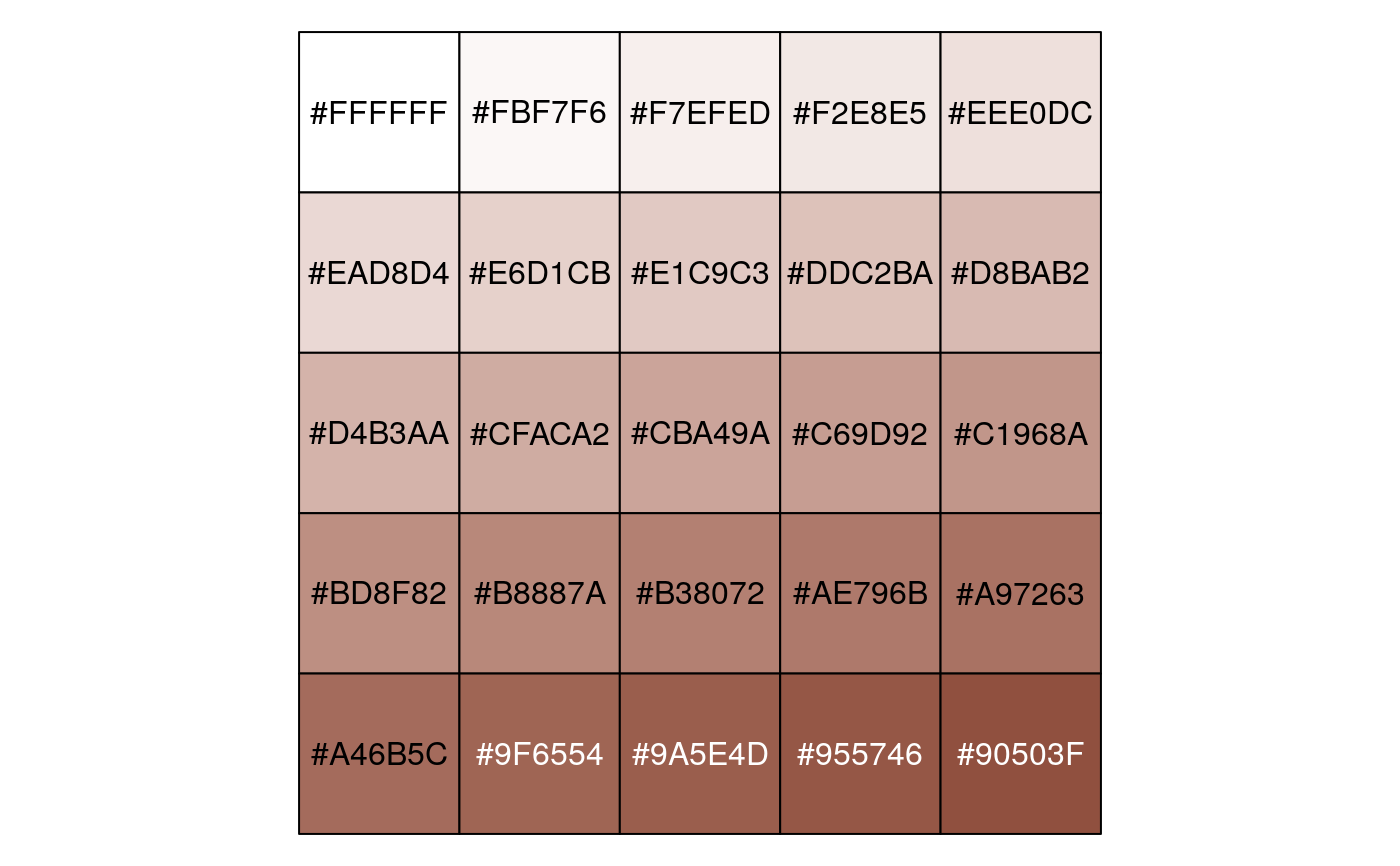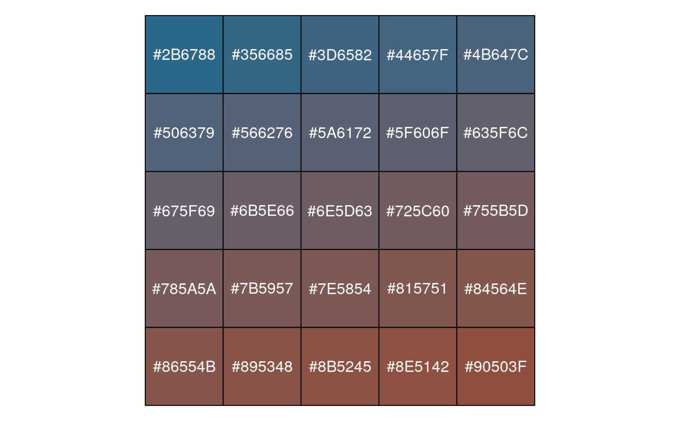 seq_gradient_pal(low = mnsl("10B 4/6"), high = mnsl("10R 4/6"), space = "Lab")