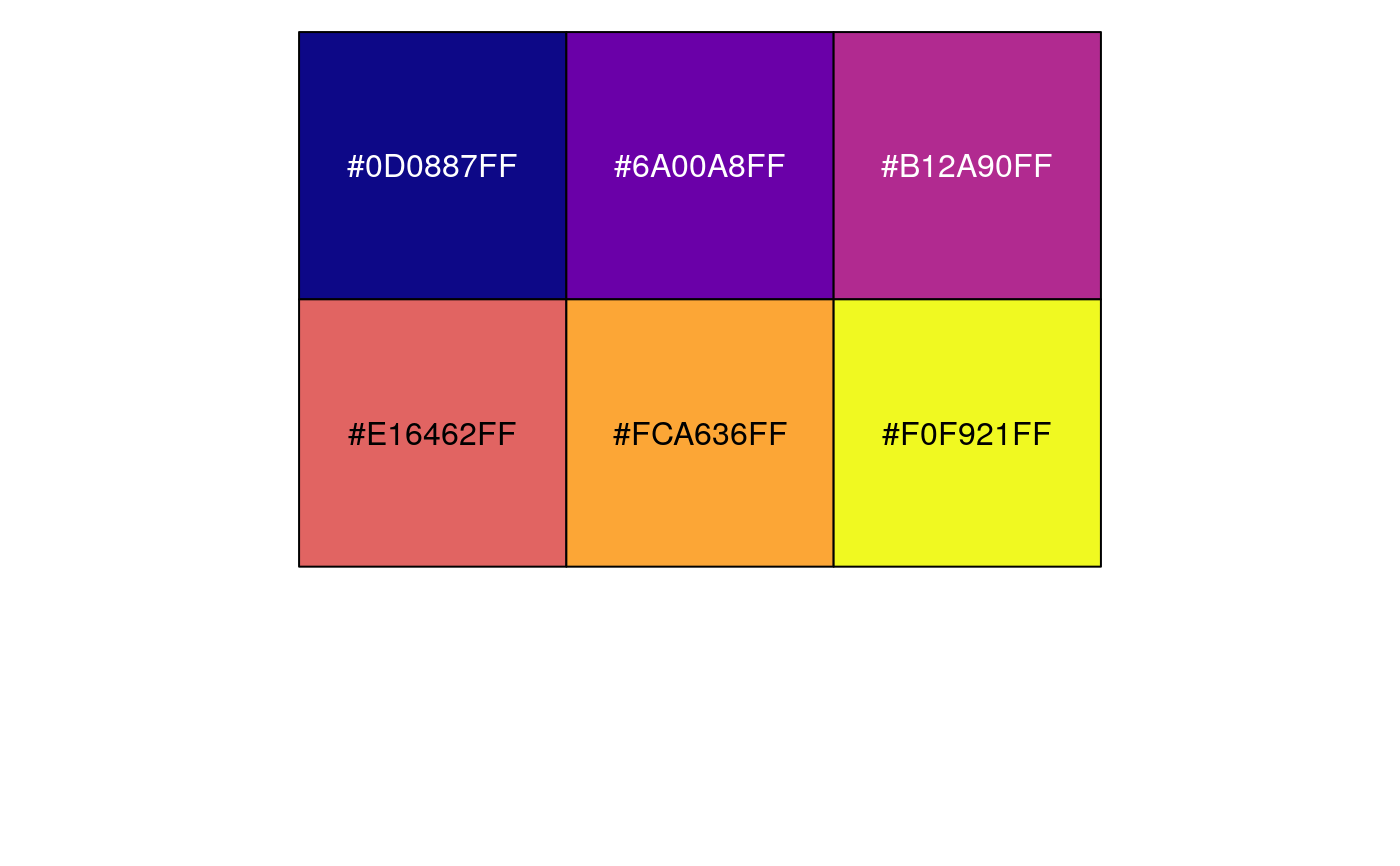 | option | A character string indicating the colormap option to use. Four options are available: "magma" (or "A"), "inferno" (or "B"), "plasma" (or "C"), "viridis" (or "D", the default option) and "cividis" (or "E"). |