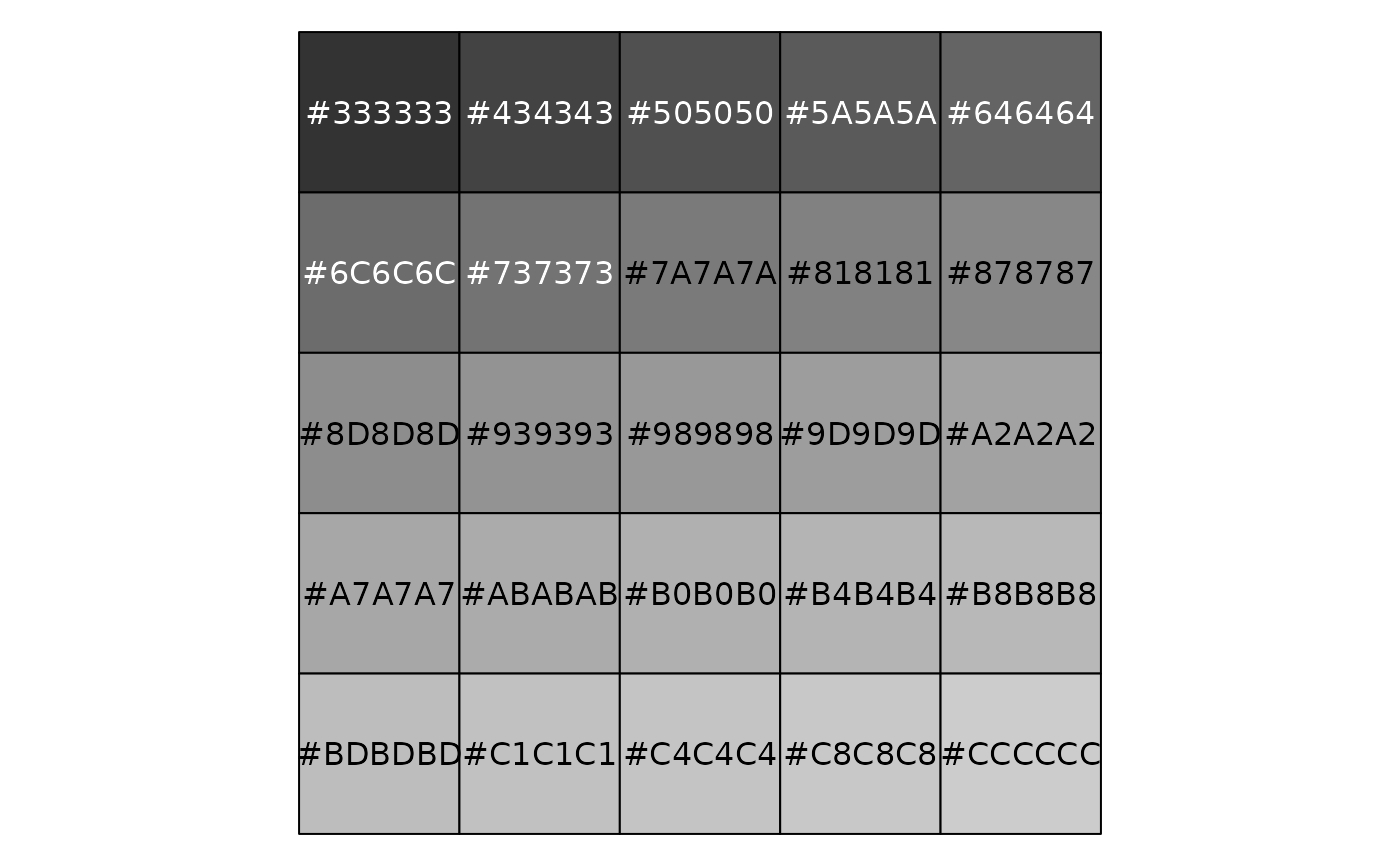 show_col(grey_pal()(25)) show_col(grey_pal(0, 1)(25))
