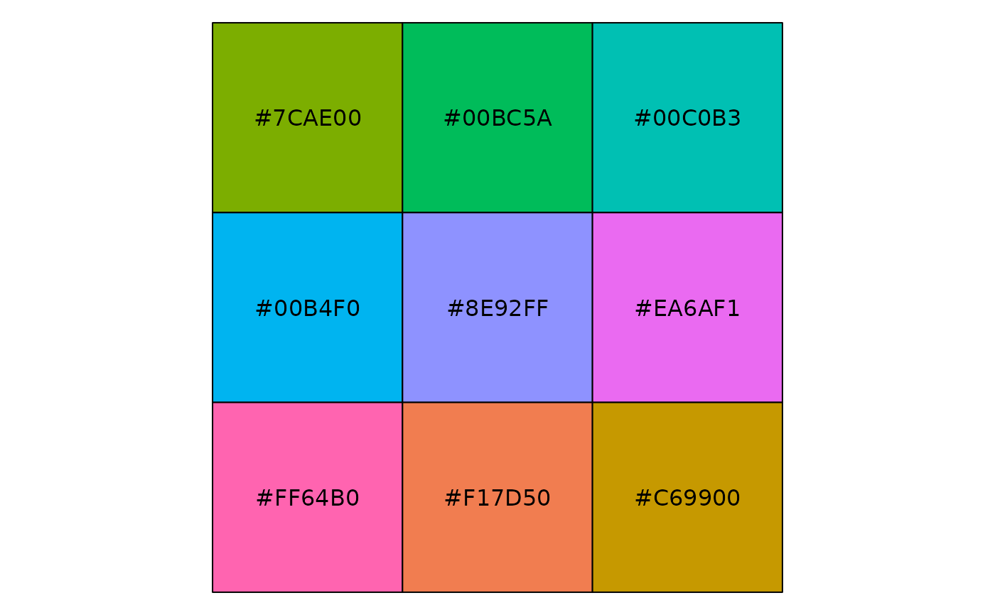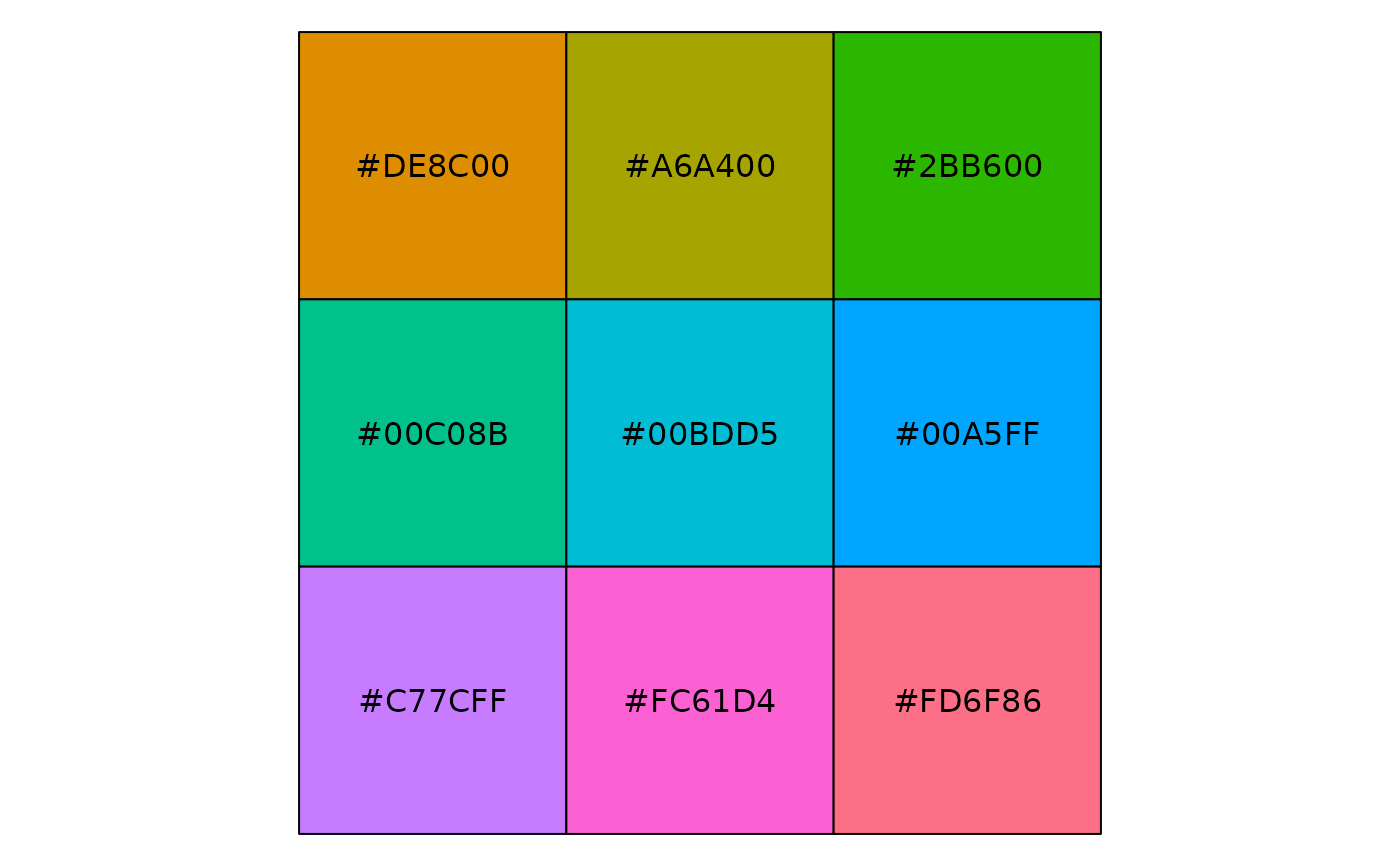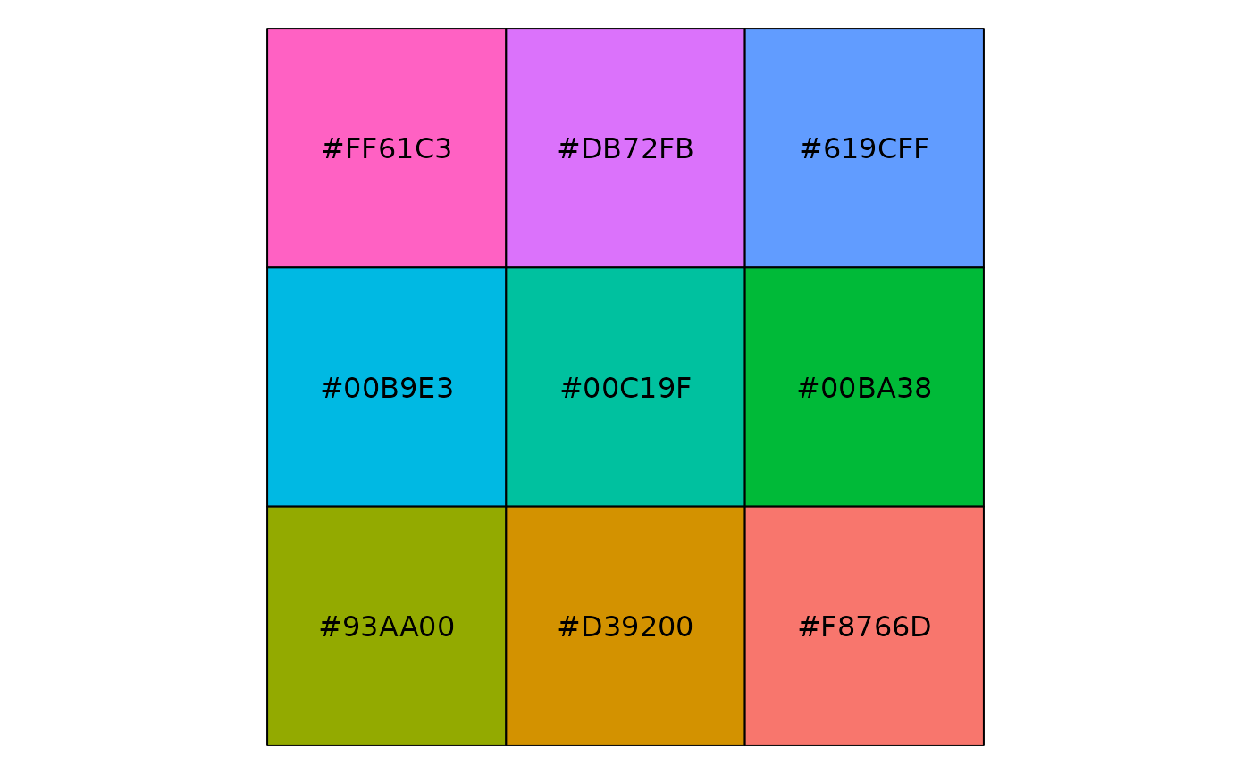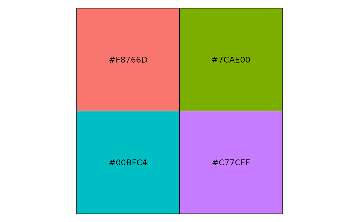 hue_pal(h = c(0, 360) + 15, c = 100, l = 65, h.start = 0, direction = 1)range of hues to use, in [0, 360]