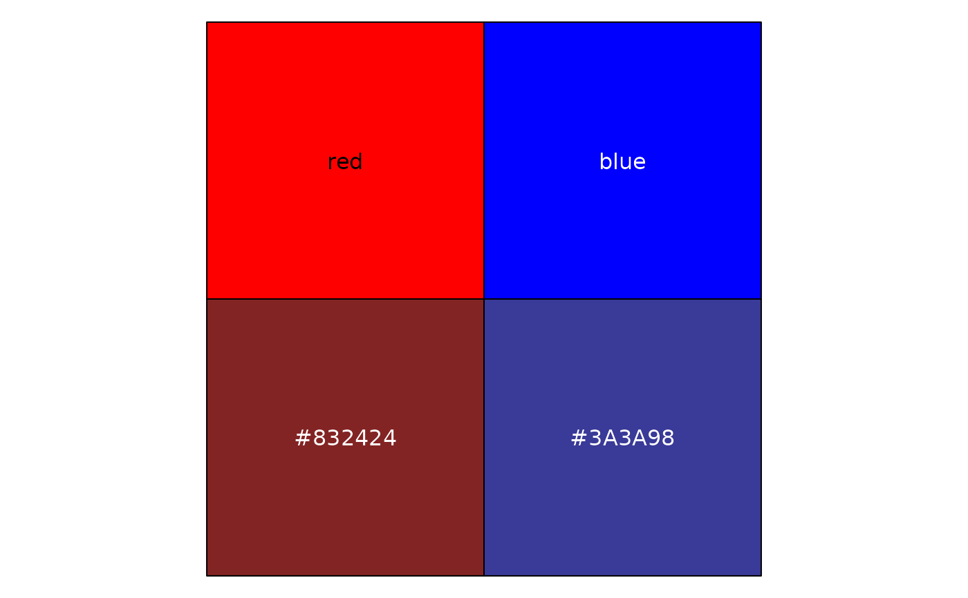 muted("red") #> [1] "#832424" muted("blue") #> [1] "#3A3A98" show_col(c("red", "blue", muted("red"), muted("blue")))