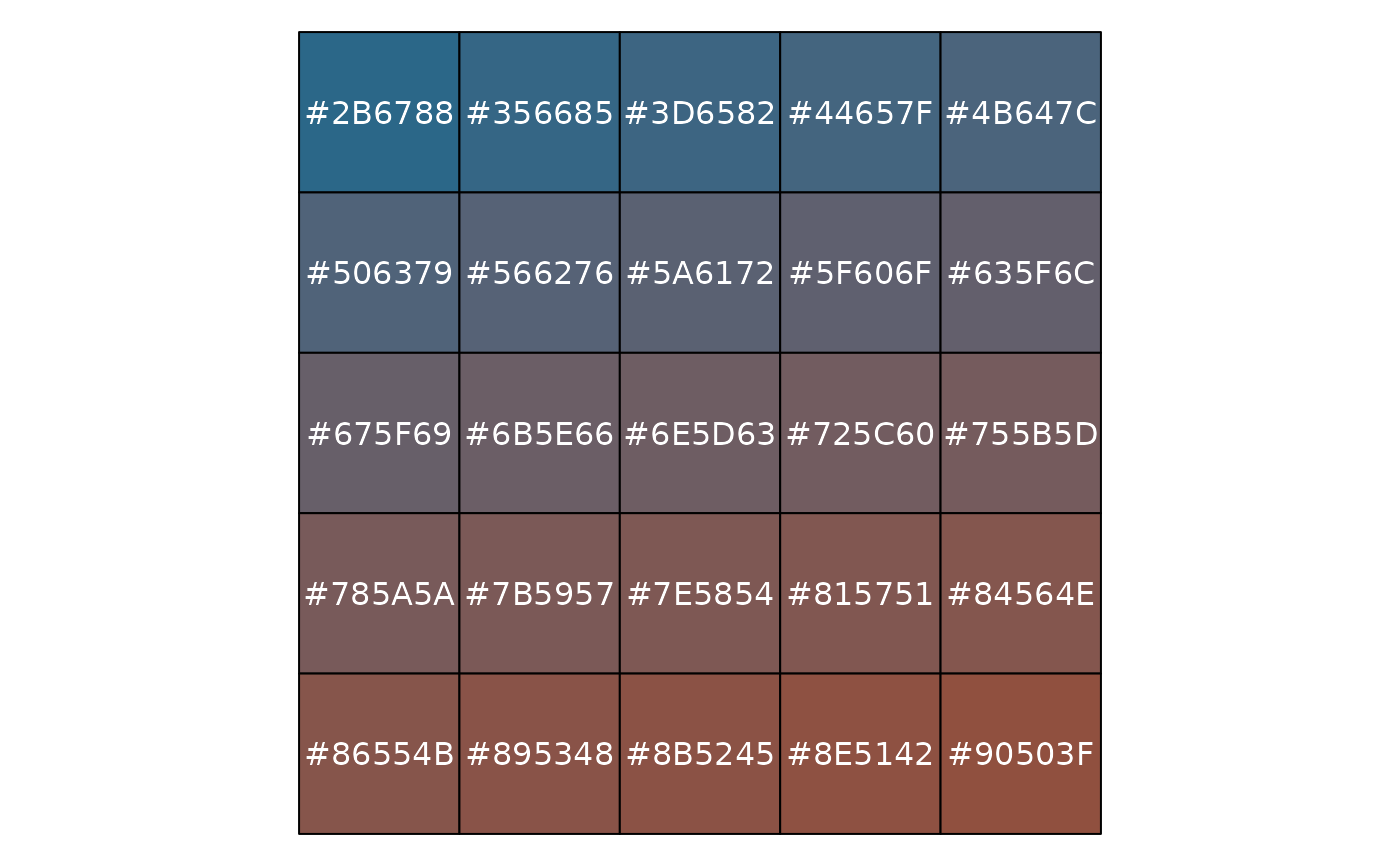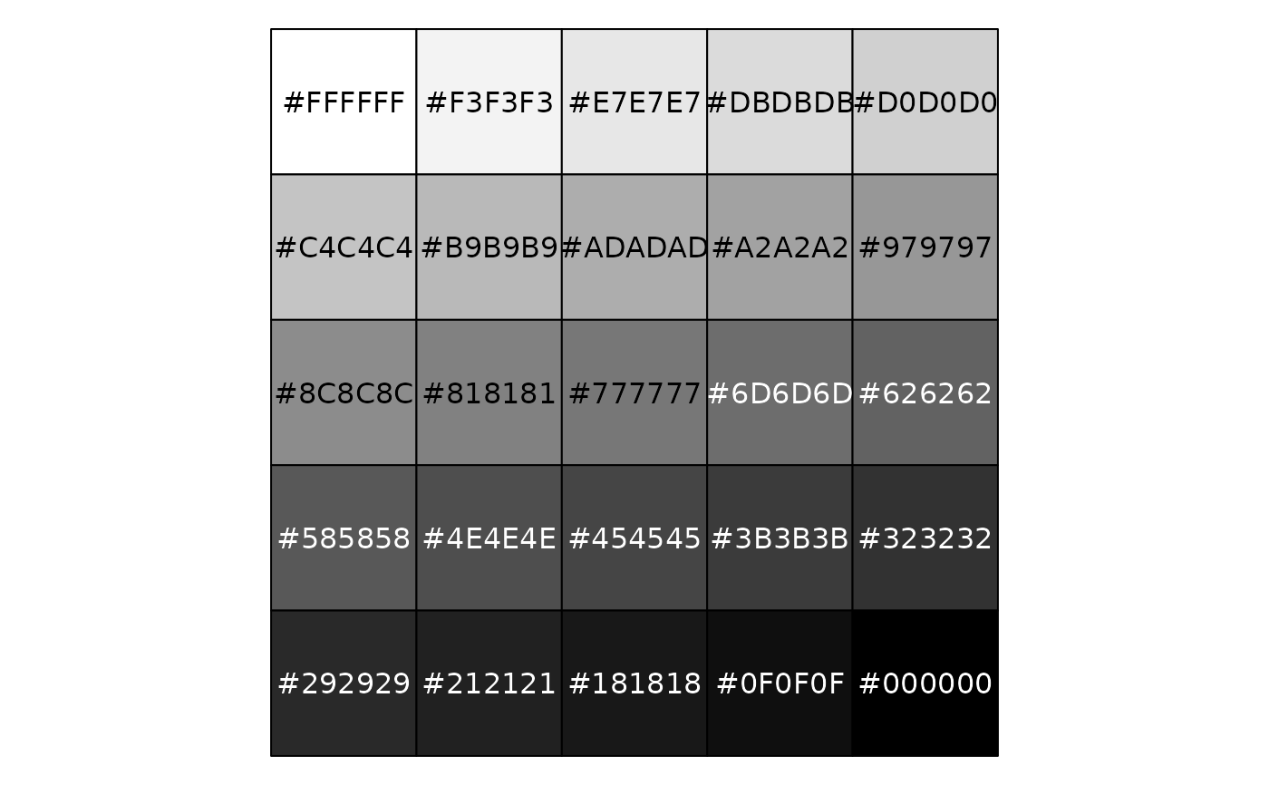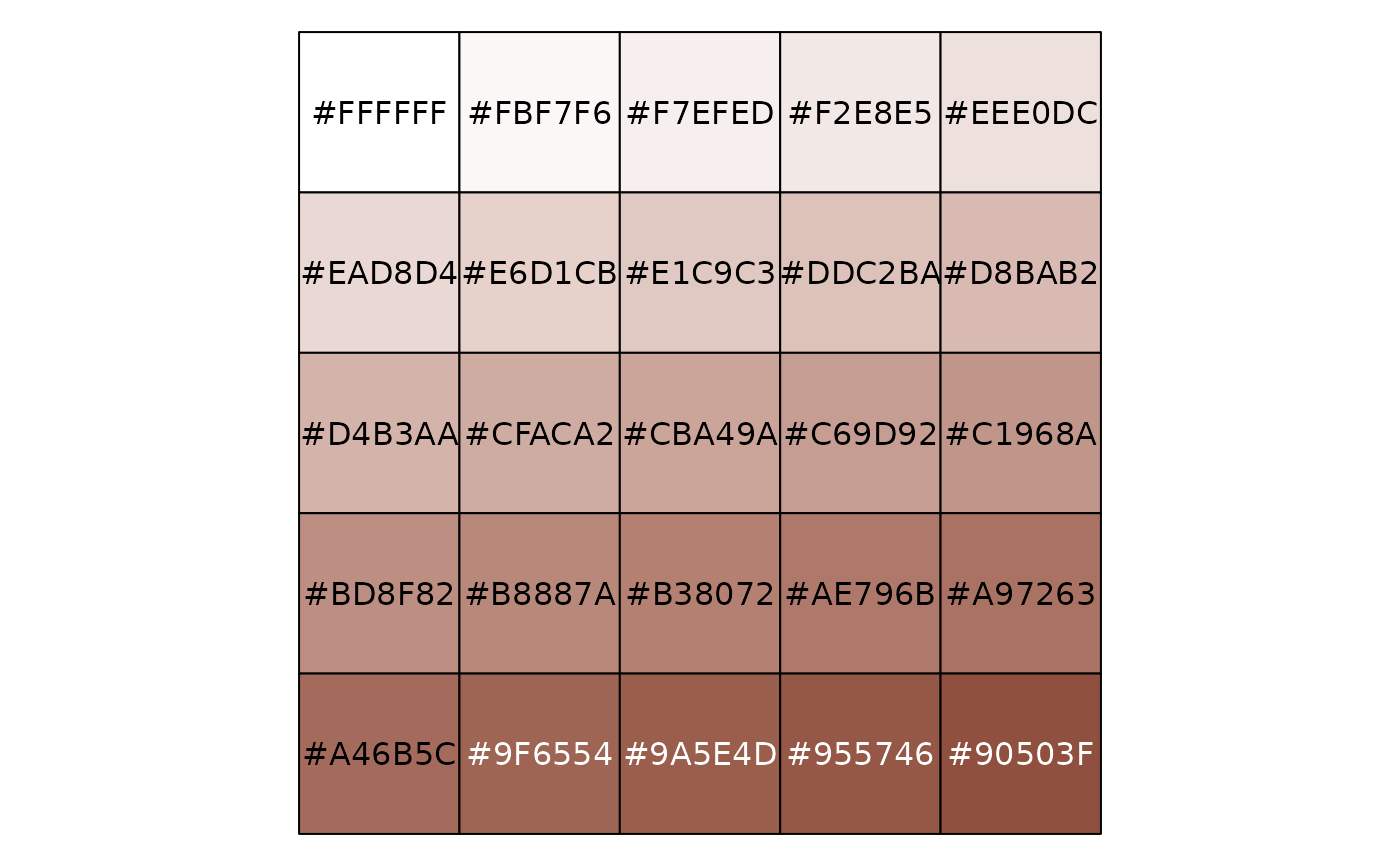 x <- seq(0, 1, length.out = 25) show_col(seq_gradient_pal()(x)) show_col(seq_gradient_pal("white", "black")(x)) library(munsell) show_col(seq_gradient_pal("white", mnsl("10R 4/6"))(x))