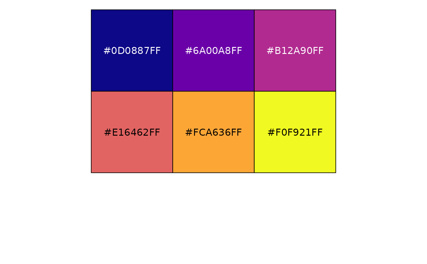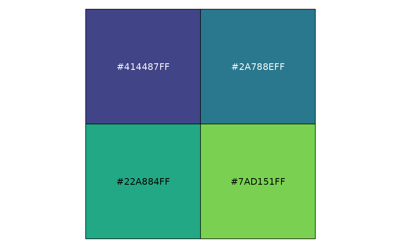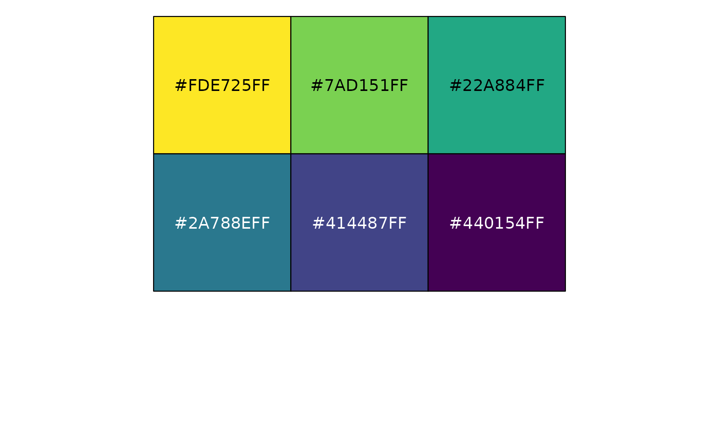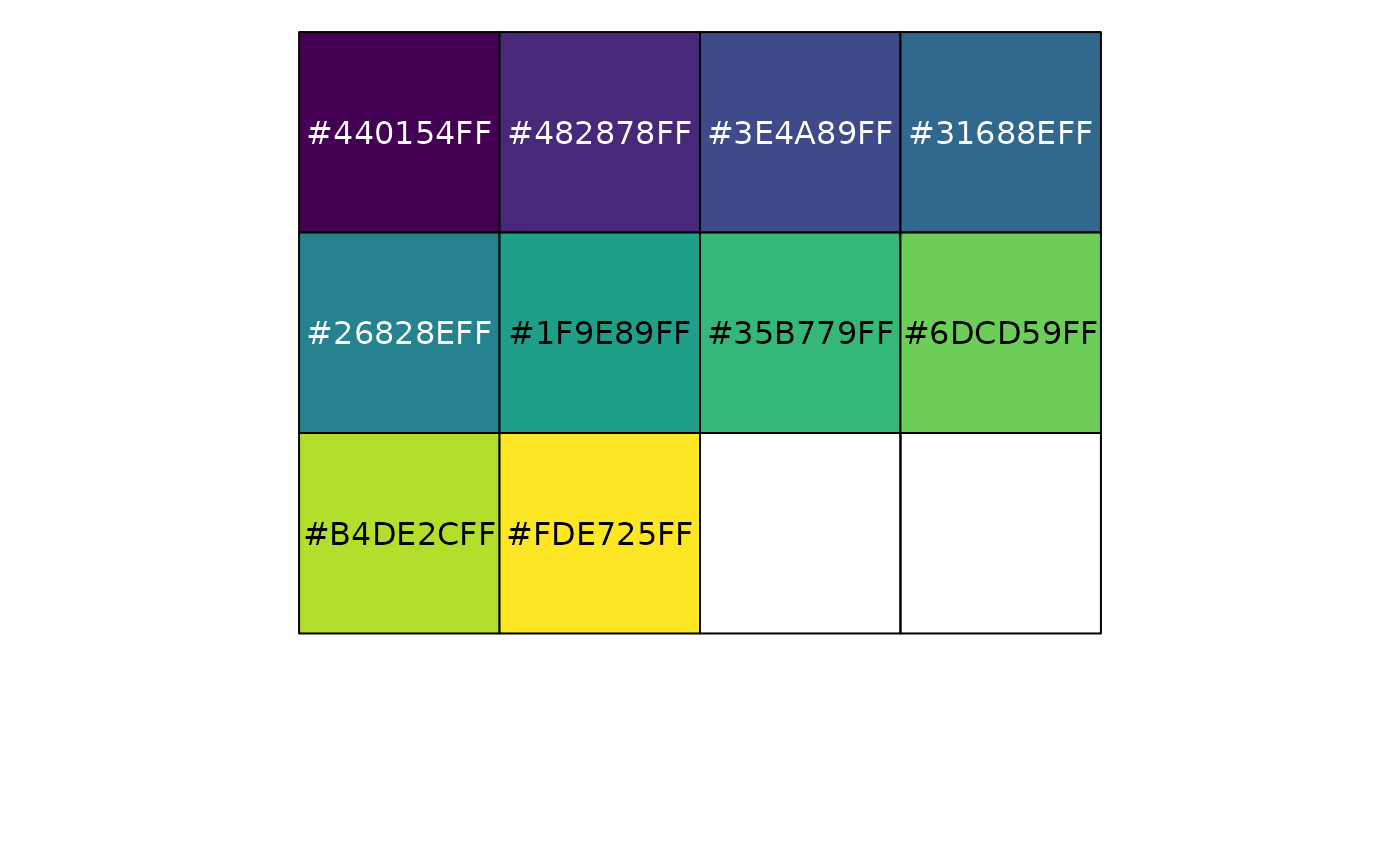 viridis_pal(alpha = 1, begin = 0, end = 1, direction = 1, option = "D")The alpha transparency, a number in [0,1], see argument alpha in