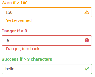 When the above input is >=2, both feedback*() function conditions are TRUE, but Only the feedbackDanger() is displayed because it is called after the feedbackWarning().