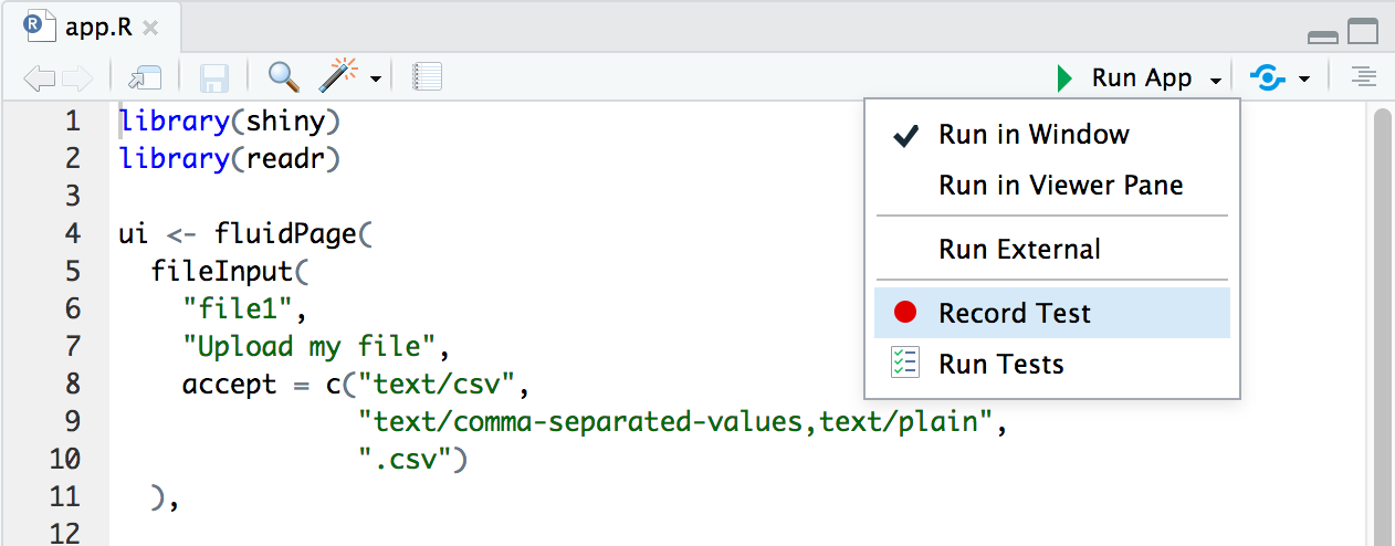 ide.RmdThe RStudio IDE provides a graphical interface that make it even easier to create tests for Shiny applications. The GUI provides buttons for running shinytest commands, so that you don’t have to remember them. These features are available in version 1.2 of the IDE and above.