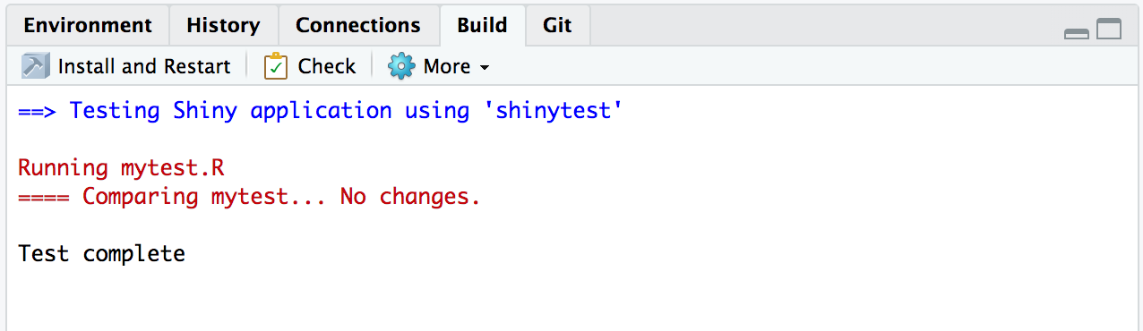 If you click on Run Tests, it will run all the test scripts in the tests/ directory, and display the results in the Build pane. If the tests pass, it will look something like this: