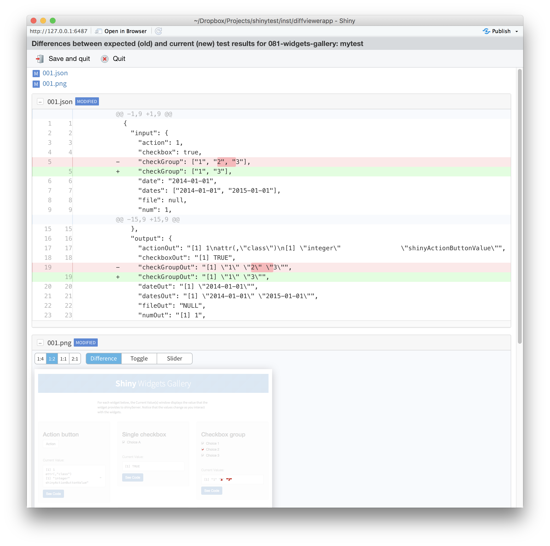 If you press y and then Enter, it will open a Shiny application which shows the differences between the expected and current results. For screenshots, the differences will be highlighted in red. You can also choose different ways of viewing the differences in screenshots. It will look something like this: