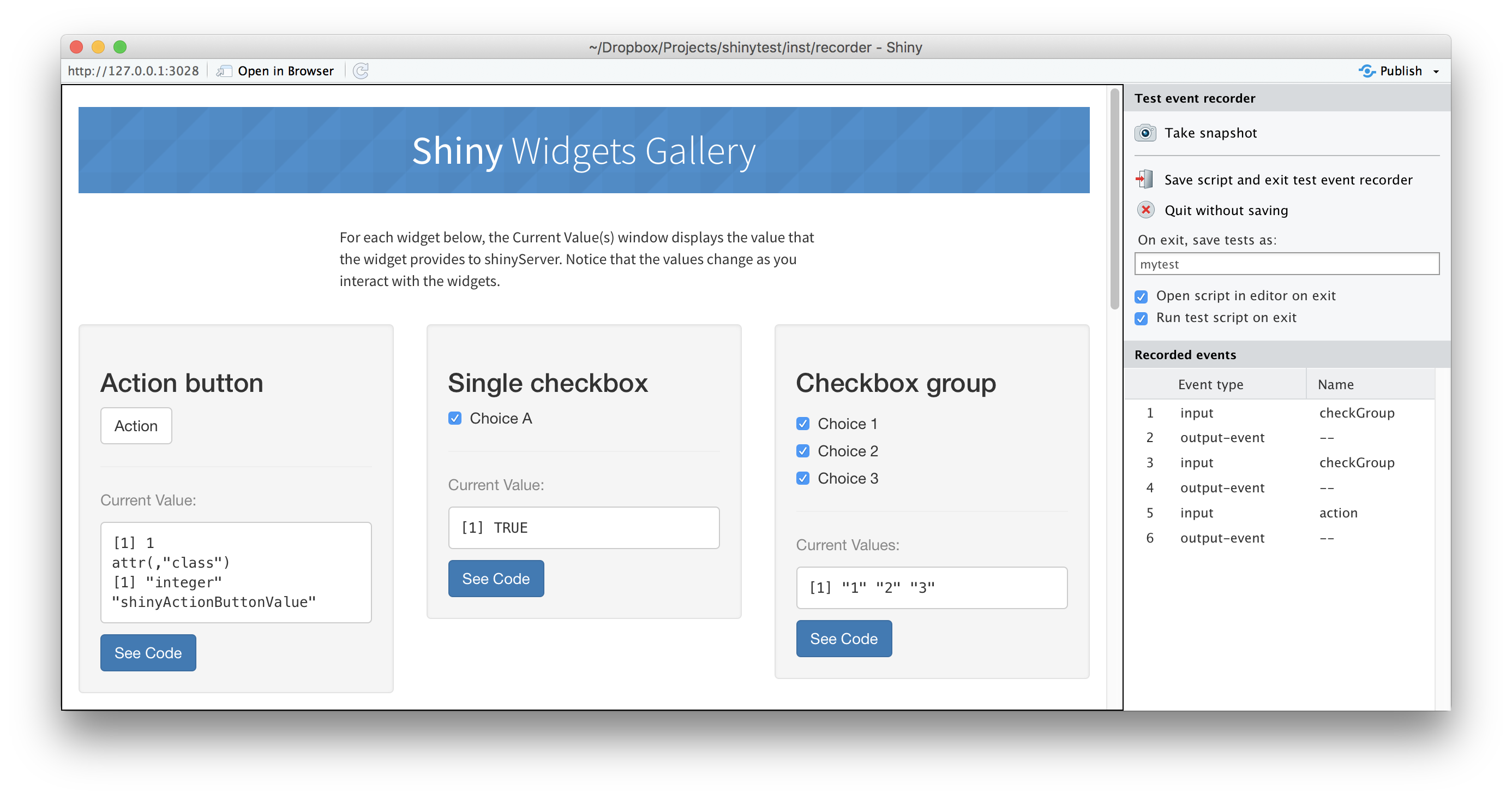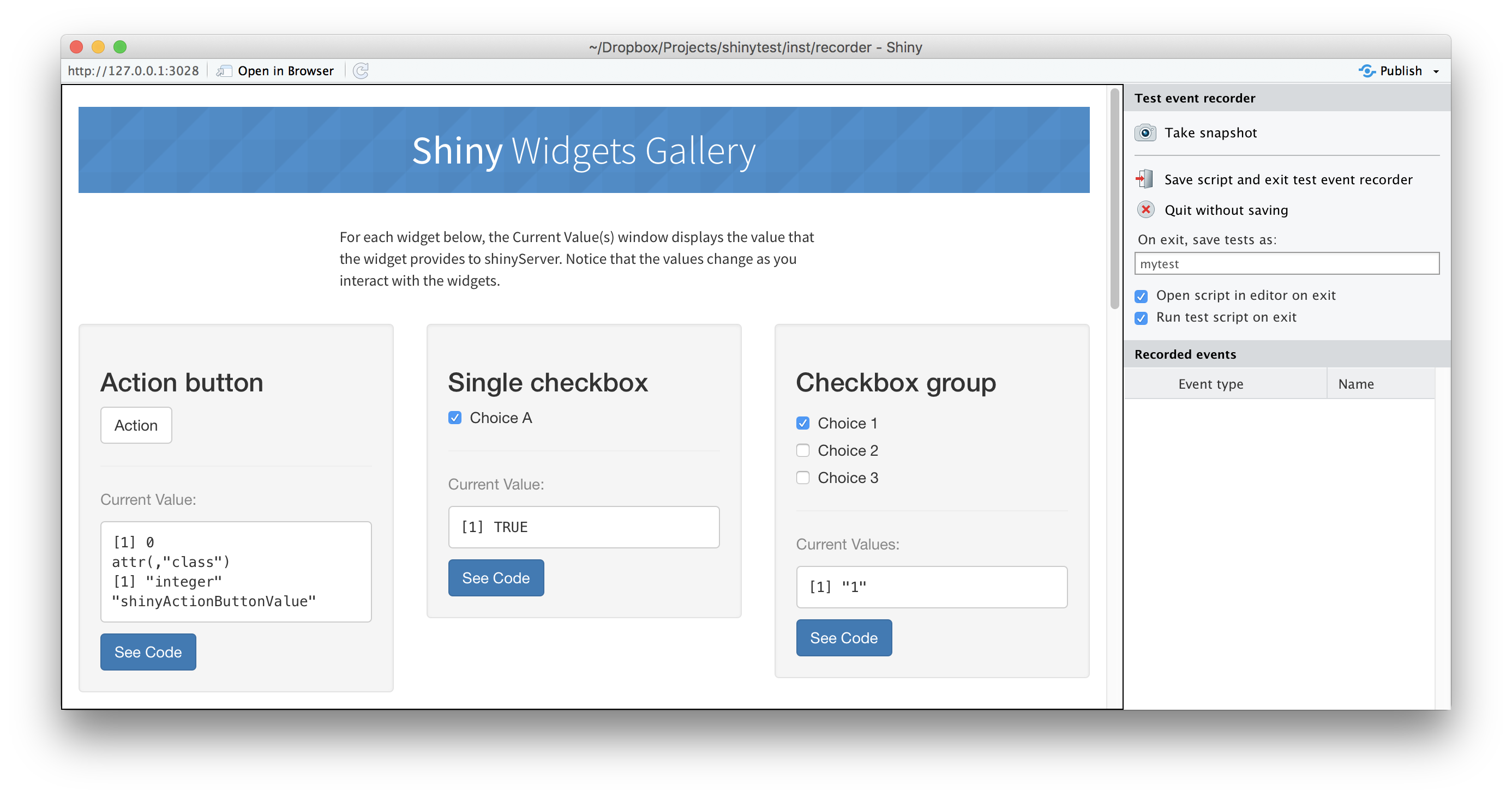 On the left is the target app (in this case, the “Shiny Widgets Gallery”), and on the right is the recorder app (titled “Test event recorder”). Note that you may need to make the browser window wider because the recorder panel occupies some space.