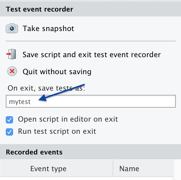 The panel on the right displays some controls for the test recorder, as well as a list of Recorded events. As you interact with the target app – in other words, when you set inputs on the app – you will see those interactions recorded in the Recorded events list.